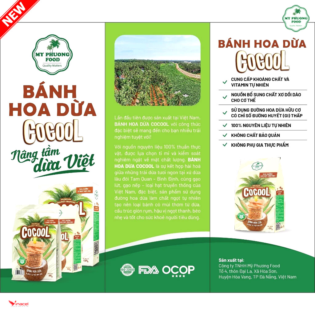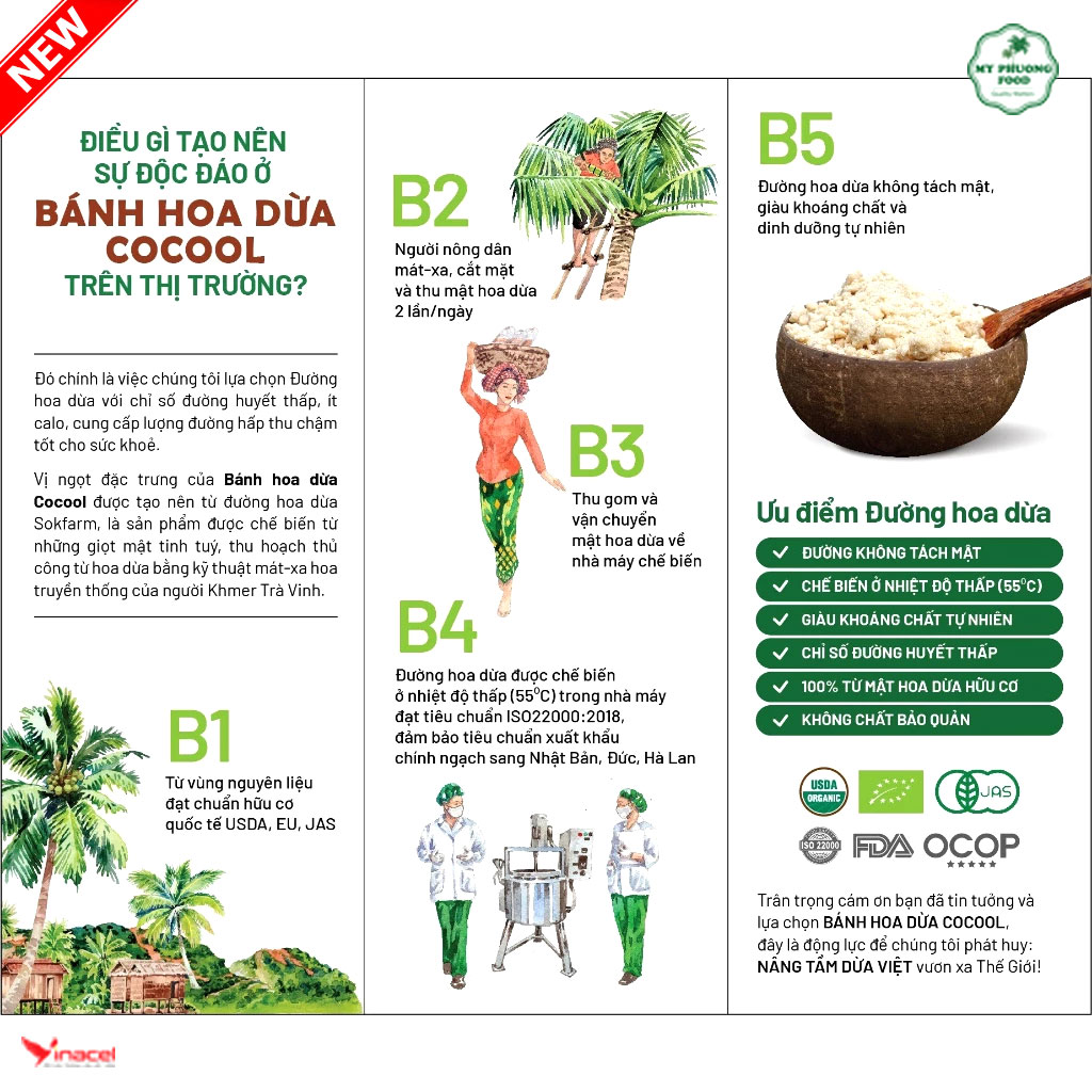 Với nguồn nguyên liệu 100% thuần thực vật, được lựa chọn tỉ mỉ và kiểm soát nghiêm ngặt về mặt chất lượng. BÁNH HOA DỪA COCOOL là sự kết hợp hài hoà giữa những trái dừa tươi ngon tại xứ dừa lâu đời Tam Quan – Bình Định, cùng gạo lứt, gạo nếp – loại hạt truyền thống của Việt Nam, đặc biệt, sản phẩm sử dụng đường hoa dừa làm chất ngọt tự nhiên tạo nên loại bánh có mùi thơm từ dừa, cấu trúc giòn rụm, hậu vị ngọt thanh, béo nhẹ và tốt cho sức khoẻ người tiêu dùng. Mỹ Phương là thương hiệu lâu năm chuyên bán các loại bánh dừa này nên chúng tôi có thể đảm bảo rằng giá cả cạnh tranh và chất lượng hàng đầu.