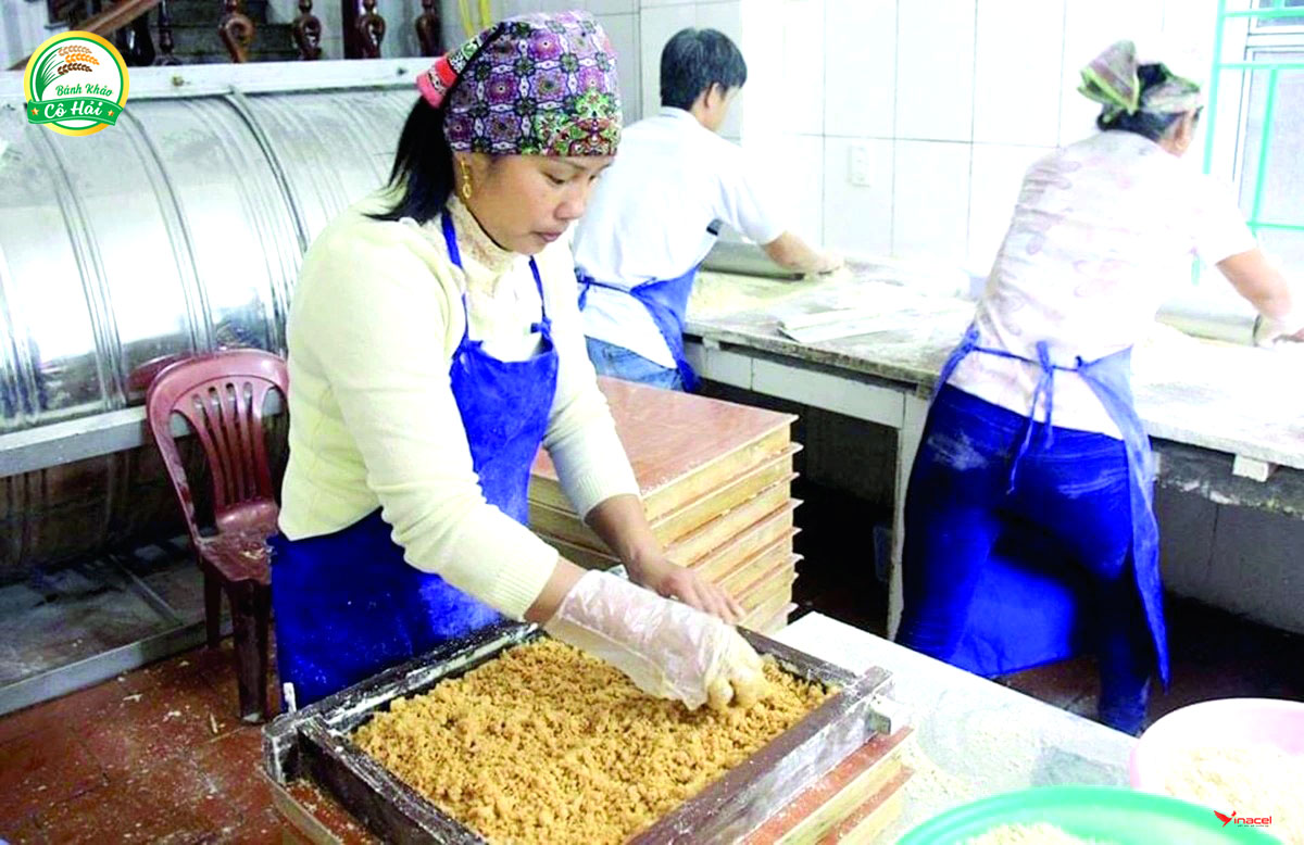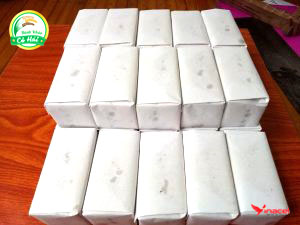 Sau đó mang bột nén vào khuôn. Nén bánh vào khuôn là công đoạn đòi hỏi sự khéo léo của người làm bánh, nếu nén mạnh tay quá bánh sẽ cứng, còn nhẹ quá bánh lại dễ bị bở, vỡ vụn ra, không thành miếng. Việc cắt bánh phải làm ngay sau khi ép bột, bởi nếu để lâu bột sẽ khô, khó cắt. Cuối cùng là gỡ bánh ra khỏi khuôn và dùng giấy trắng hoặc giấy màu để gói bánh.
