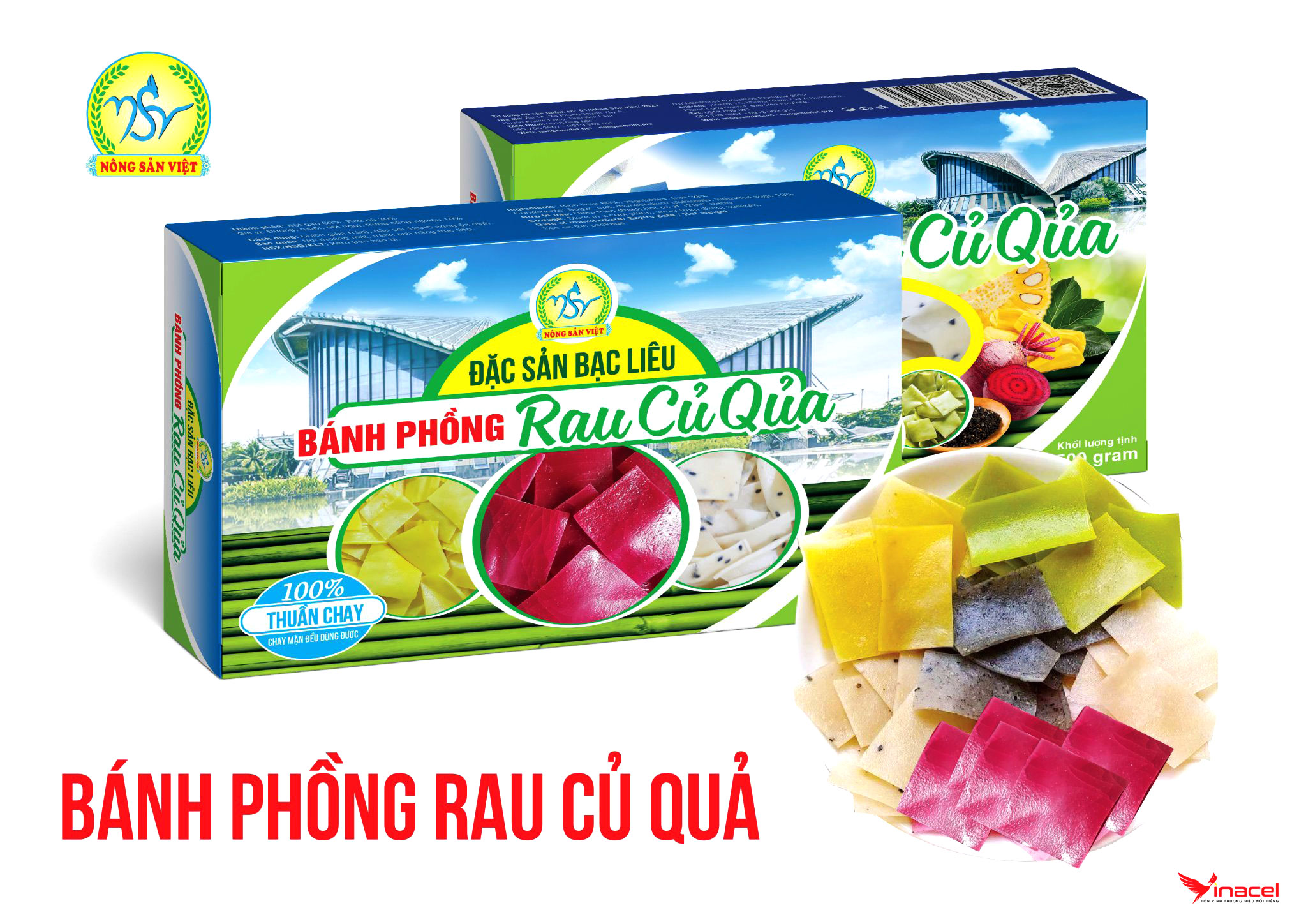 Từ truyền thống làm bánh phồng của gia đình, chúng tôi đã không ngừng sáng tạo tìm ra công thức sản xuất Bánh phồng tôm rau củ quả Nông Sản Việt - món ngon của thực khách thuần chay từ bột, rau củ quả (mít, khoai tây, lá dứa, củ dền, cà rốt, mè đen, khoai môn), gia vị và các làm thuận theo tự nhiên. Rau củ quả đã sơ chế xong, xay nhuyễn, trộn gia vị, cán bánh và đem phơi. Hương vị bánh sẽ chẳng đậm đà nếu thiếu vị béo thơm thơm của nước cốt dừa mà ai có dịp qua sân phơi vào mùa nắng cùng phải dừng chân ghé lại hỏi: “đây là món gì?”.