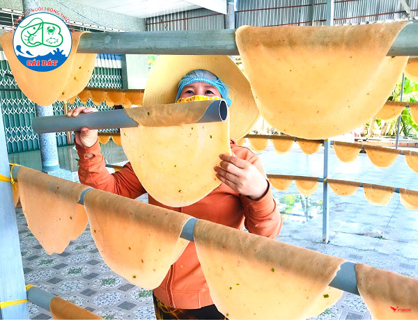 Tiếp theo là công đoạn tráng bánh, phơi bánh, cắt miếng và đem phơi nắng, cuối cùng là đóng gói thành phẩm. Điểm đặc biệt của bánh phồng tôm HTX Cái Bát là công đoạn tráng bánh được làm hoàn toàn thủ công từ đôi bàn tay khéo léo của các chị em thợ lành nghề tại địa phương và nhất là sản phẩm không sử dụng chất phụ gia, phẩm màu, chất bảo quản nên đảm bảo an toàn cho sức khỏe người tiêu dùng.