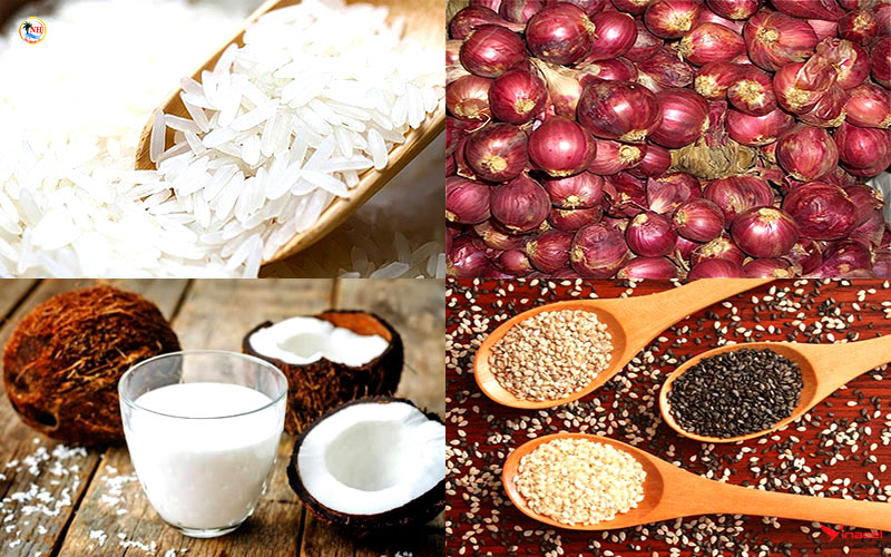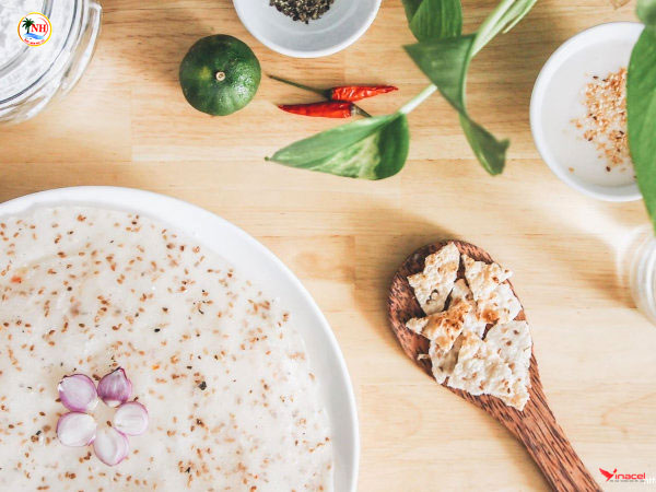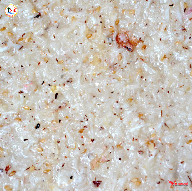 • Hành tím sau khi mua về, bạn lột vỏ rồi rửa sạch. Sau đó, bạn cho tiêu, hành tím, hạt mè, nước cốt dừa cùng ½ muỗng cà phê muối vào xay cùng bột gạo đến khi hỗn hợp được sánh mịn.