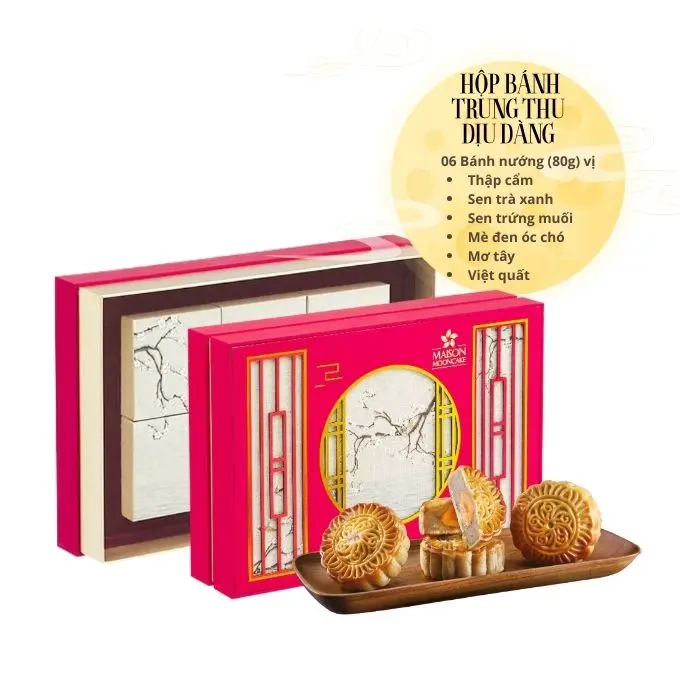 Hộp bánh trung thu Maison Dịu Dàng 6 bánh được thiết kế bên ngoài bắt mắt, bên trong là những chiếc bánh thơm ngon hảo hạng. Bánh được các nghệ nhân có tay nghề, kinh nghiệm lâu năm làm với công thức chế biến độc đáo, kết hợp giữa bánh truyền thống và hiện đại phù hợp với người tiêu dùng trên cả nước. 6 bánh trong hộp được làm với 6 vị nhân khác nhau gồm: nhân Thập cẩm, nhân Custard, nhân Sen trà xanh, nhân Đậu đỏ, nhân Mè đen và nhân Hạt sen. Nhân bánh dẻo mềm, ngọt thanh được khéo léo đặt trong lớp vỏ vàng óng mỏng mượt bên ngoài thấp hấp dẫn, không có thực khách nào cưỡng nổi.