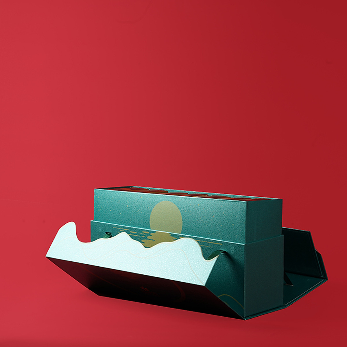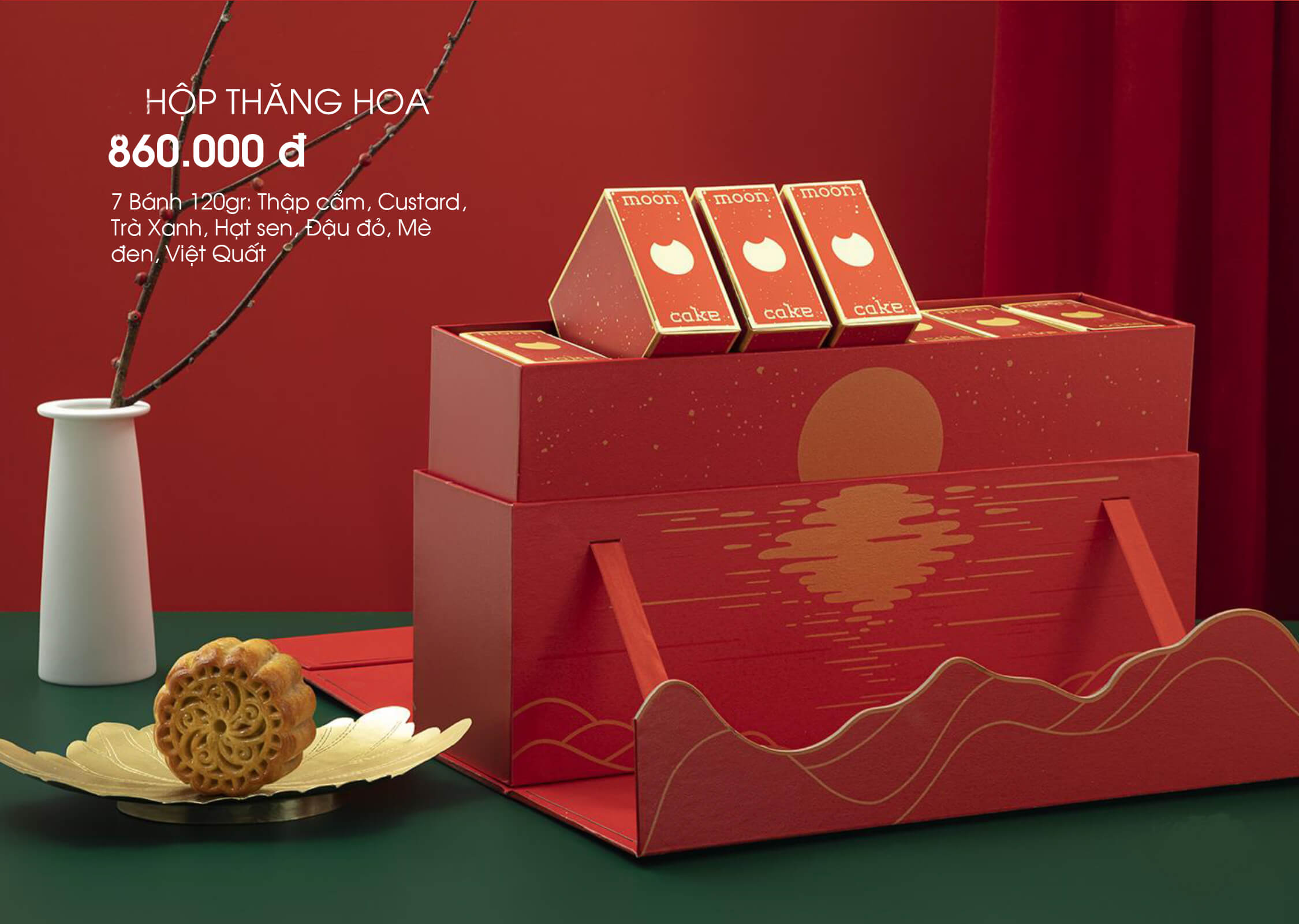 Hộp bánh trung thu Thăng Hoa được thiết kế nắp cánh bướm tinh tế, hiện đại. Hộp có màu xanh huyền bí, màu đỏ ấm áp như lời chúc đêm trăng đầm ấm, hạnh phúc mà Maison muốn gửi đến mọi gia đình. Trên hộp được in, ép nhũ hình ảnh ánh trăng tròn vành vạnh chiếu sáng in dưới hồ nước êm đềm như những bức tranh miền quê thân thuộc, gần gũi với người dân Việt Nam. Bánh trung thu Maison hộp thăng hoa 7 bánh như một kiệt tác đong đầy cảm xúc, ấm áp mùa trăng đến với mỗi gia đình.
