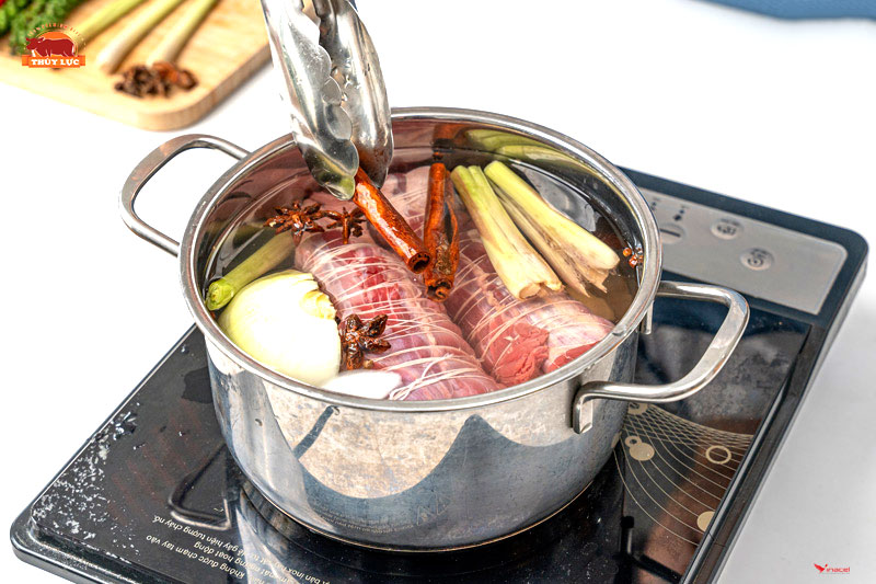 + Đổ lượng nước đủ ngập phần thịt bò, thêm một ít muối tinh.