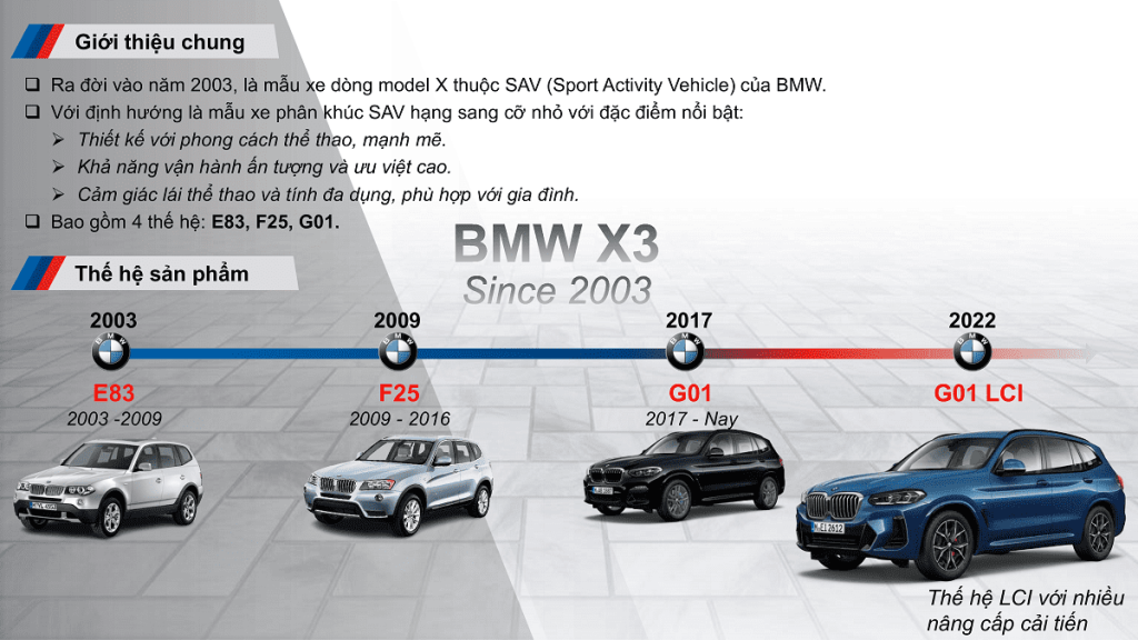 BMW X3 là mẫu xe Sports Activity Vehicle (SAV) xe hạng sang gầm cao cỡ trung. Tổng doanh số bán cộng dồn 1,5 triệu xe trong hai thế hệ trước giúp X3, là một trong những mẫu xe SUV hạng sang cỡ trung, thành công nhất phân khúc trên toàn cầu. BMW X3 2023 là một trong những dòng xe SUV sang trọng, trẻ trung dành gia đình và được ưa chuộng nhất trên thế giới.