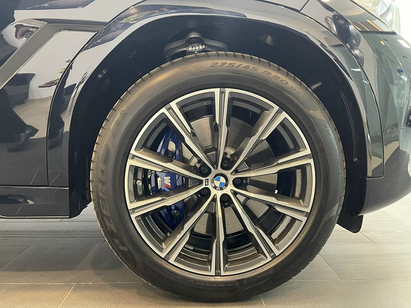 Không phải là SUV truyền thống nên vòm bánh xe BMW X6 vẫn đồng màu với thân xe, bên dưới là bộ la-zăng 5 chấu kép kích thước 20 inch có logo M Sport. Xe có khe thoát gió để phù hợp với tính khí động học khi vẫn hành ở tốc độ cao