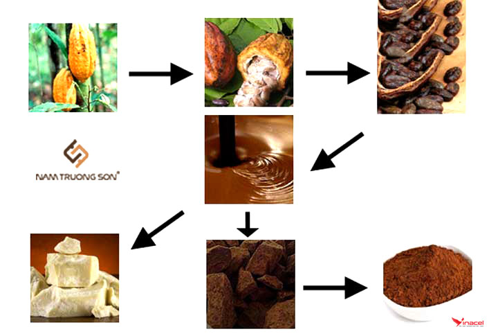 Hạt cacao được đưa vào máy phân loại sàng lọc loại bỏ tạp chất, đến rang và tách vỏ. Sau đó, mảnh nhân cacao được đem đi xay nhuyễn và trích bơ bằng máy ép thủy lực, sản phẩm được nghiền mịn xong là bột ca cao nguyên chất. Bột cacao nguyên chất được phối trộn với bột sữa tách béo và đường đã cho ra đời sản phẩm bột cacao 3 trong 1 thơm ngon và bổ dưỡng.
