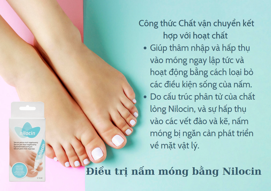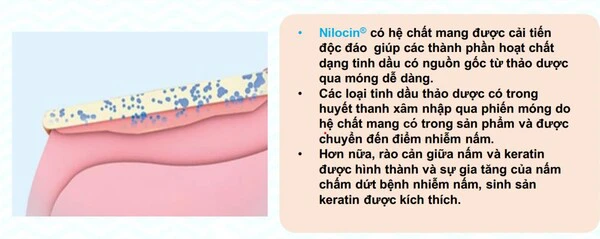 – Loại bỏ điều kiện sống của nấm mốc: Nilocin xâm nhập vào khoang móng, sản xuất keratin được kích hoạt. Giúp bão hòa lớp keratin ở móng.
