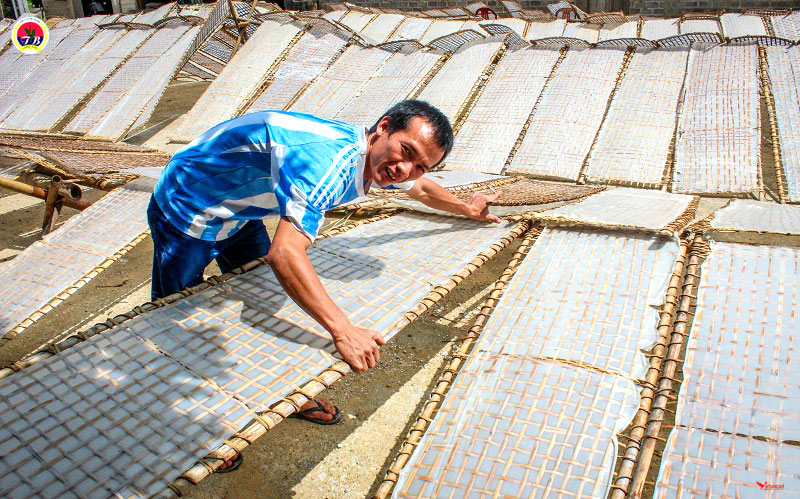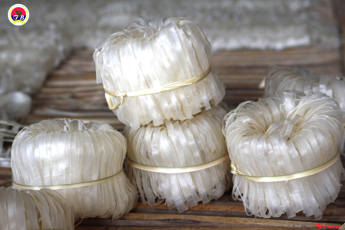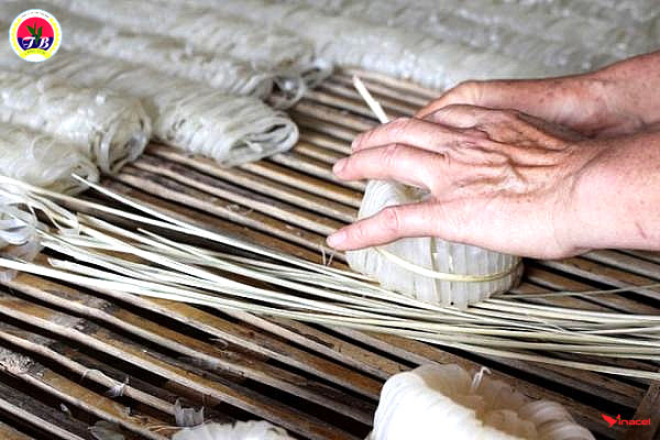 Bột nghiền xong, tiếp tục ủ qua 1 đêm, lắng xuống, gạn nước bên trên, sau đó hòa bột với nước sạch rồi mới đem đi tráng. Theo bà Đỗ Thị Vẩn, từ khi vo gạo, ngâm gạo, rồi nghiền, mỗi công đoạn đều phải thay nước liên tục. Bột gạo sạch sẽ thì sợi mì mới đạt được độ trắng trong bắt mắt thực khách.