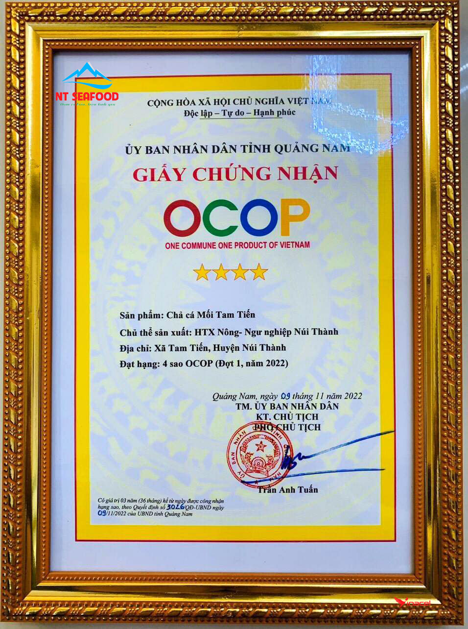 Chúng tôi tự hào khi sản phẩm Chả cá mối Tam Tiến được công nhận OCOP 4 sao, điều này chứng minh sự cam kết của chúng tôi với chất lượng và giá trị đích thực. Bạn có thể yên tâm hoàn toàn khi lựa chọn sản phẩm của chúng tôi - đó là lựa chọn cho sự tươi ngon và an toàn.