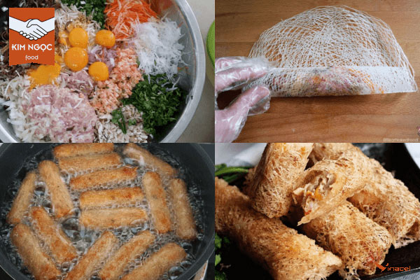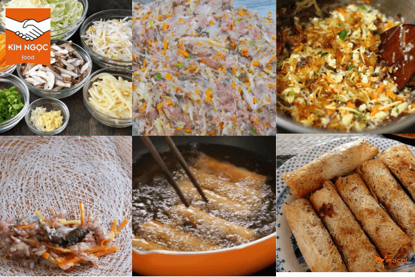 • Gói chả giò: Sau khi nhân đã hấp chín và để nguội, cho một muỗng cà phê bột chiên giòn và chén, thêm hai muỗng nước vào trộn đều tạo thành hỗn hợp sệt. Bày bánh tráng rế ra mặt phẳng, sau đó cho một lượng nhân vào, cuộn tròn thật chặt tay đến gần cuối thì dùng ngón tay lấy 1 lượng bột chiên giòn vừa đủ quét lên miệng bánh để kết dính lại.