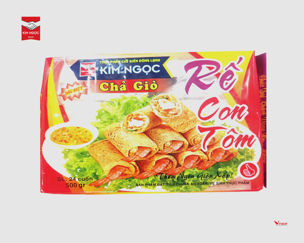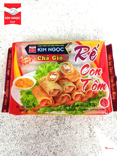 Chả giò rế con tôm Kim Ngọc gói 500g, chả giò với bánh rế giòn ngon, phần nhân con tôm được tạo hình ấn tượng, cuộn với bánh rễ giữ nguyên độ tươi ngon, được làm từ các thành phần: Tôm, cua, thịt heo, tỏi, đường, củ hành, tiêu, củ sắn, bánh tráng rế, dầu mè,...