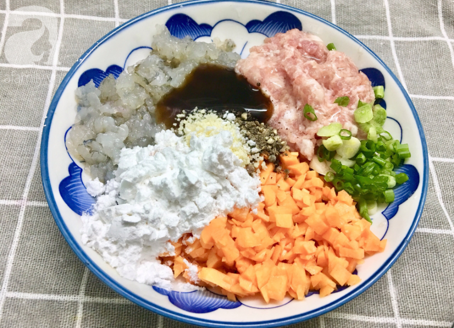 Cho tôm xay, thịt xay vào bát sạch, thêm hành khô băm nhỏ, cà rốt băm, hành lá thái nhỏ, thêm 2 thìa hạt nêm, 1/2 thìa mắm, 1 thìa đường, 1 thìa hạt điều, 1/2 thìa hạt tiêu. Tiếp đến, đảo thật đều hỗn hợp tôm thịt xay cùng các gia vị cho ngấm, cho thêm 4 thìa bột mì vào đảo đều tay lần nữa, để hỗn hợp nghỉ trong 20 phút cho ngấm.