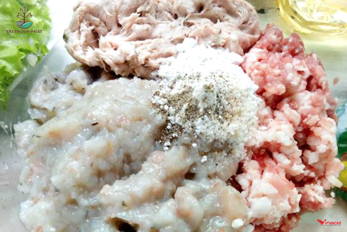 Tôm: Cắt bỏ râu tôm, đầu tôm và chân tôm sau đó rút bỏ phần chỉ đen trên lưng tôm sẽ đem rửa sạch lại với nước muối pha loãng và để ráo. Khi tôm đã được ráo nước, cho vào ngăn đá tủ lạnh khoảng 30 phút, quá trình này sẽ giúp cho tôm khi xay được mịn và bông hơn, sau khi tôm đã hơi đông cứng thì cho xuống ngăn mát tủ lạnh.