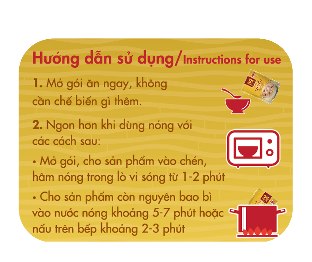 ► Mở gói, cho sản phấm vào chén, hâm nóng trong lò vi ba từ 1-2 phút.
