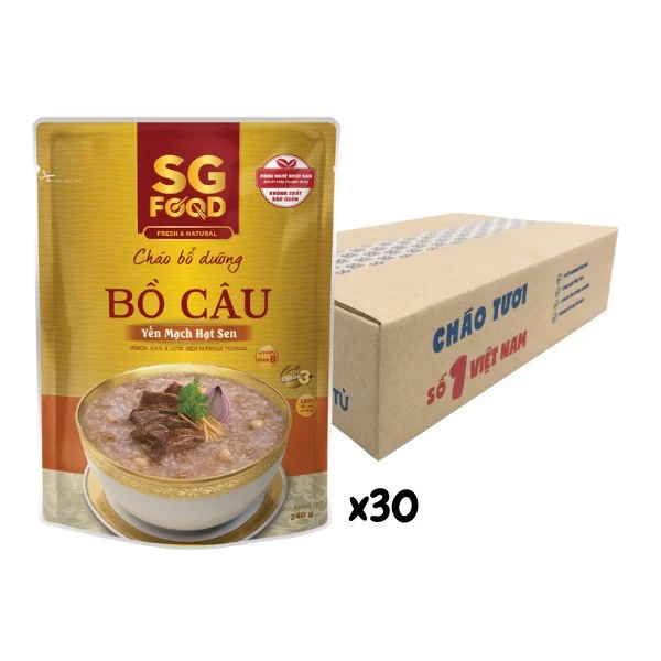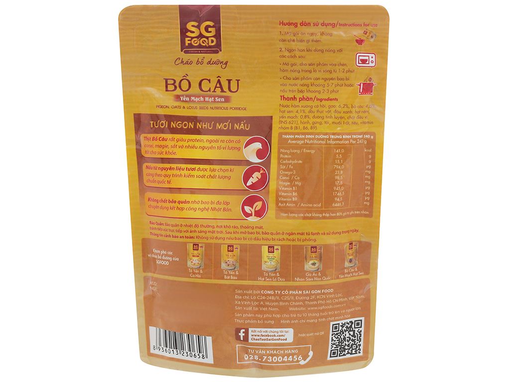 Bảo quản ở nhiệt độ thường, nơi khô ráo thoáng mát. Sau khi mở bao bì, bảo quản ở ngăn mát tủ lạnh và sử dụng trong ngày. Lưu ý không sử dụng nếu bao bì có dấu hiệu bị rách hoặc bị phồng.Cháo ăn liềntiện lợi từ thương hiệu cháo SG Food. Cháo bổ dưỡng SG Food tổ yến chim bồ câu yến mạch hạt sen gói 240g được làm từ các nguyên liệu tự nhiên, an toàn cho sức khỏe, hương vị cháo là sự kết hợp hài hòa của thịt bồ câu, yến mạch và hạt sen bổ dưỡng, thơm ngon hấp dẫn mà lại cực nhanh và đơn giản.