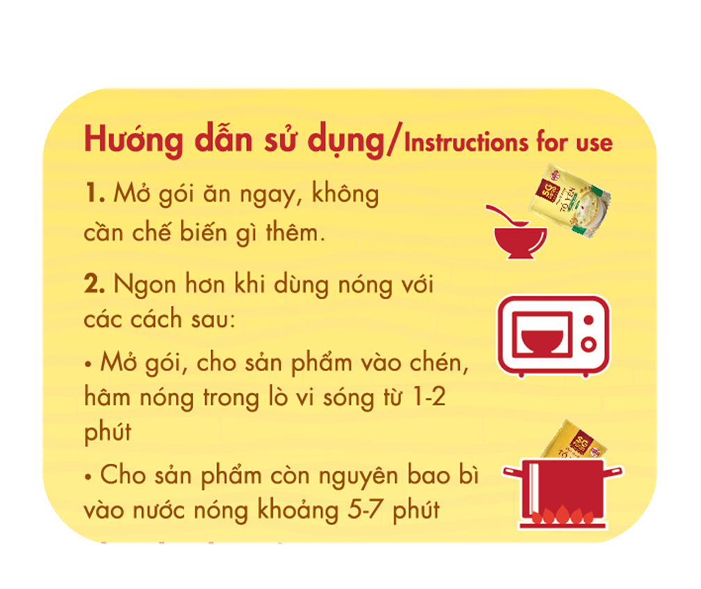 ► Mở gói, cho sản phẩm vào chén, hâm nóng trong lò vi sóng từ 1 – 2 phút.