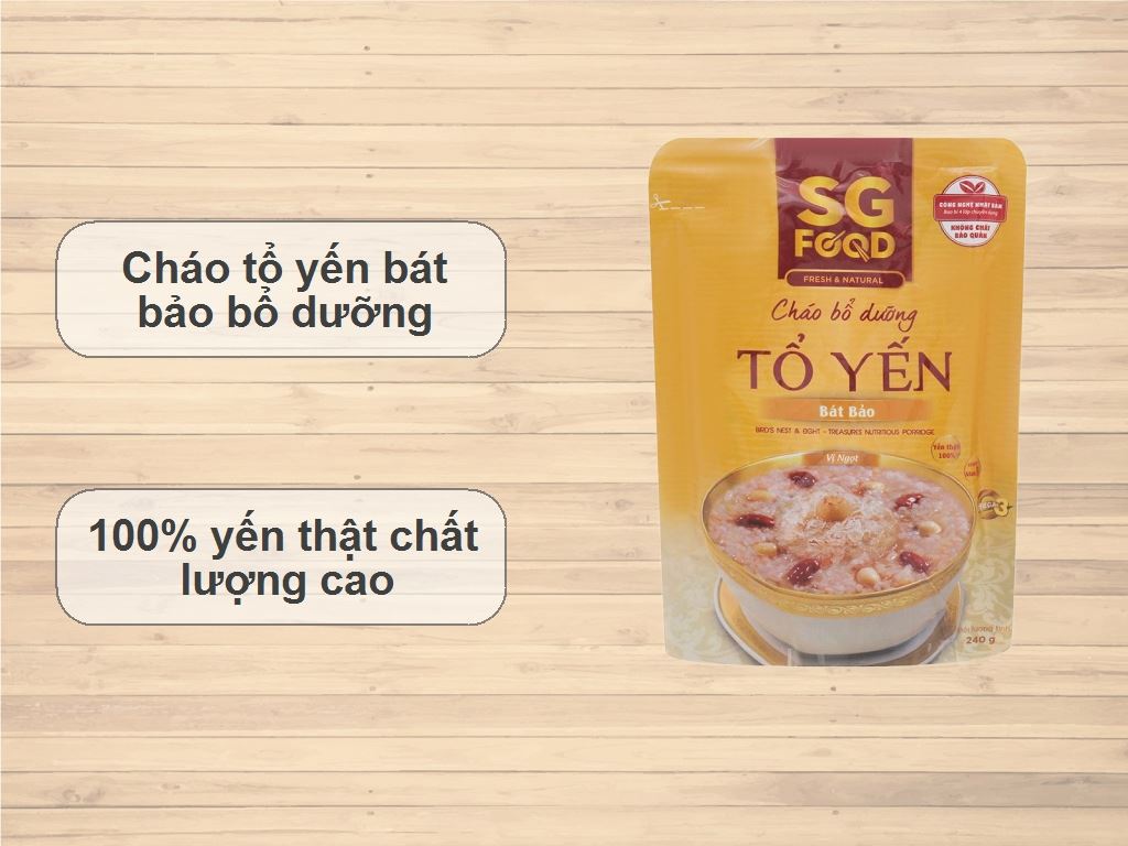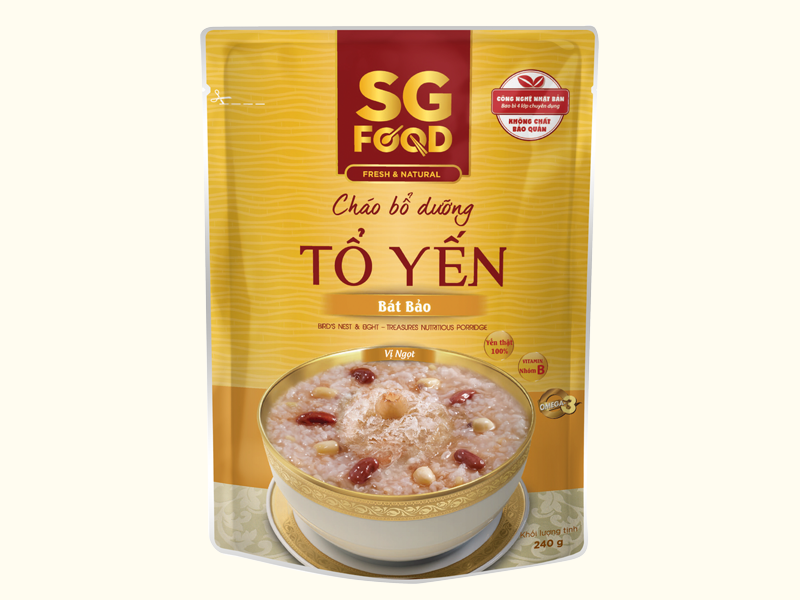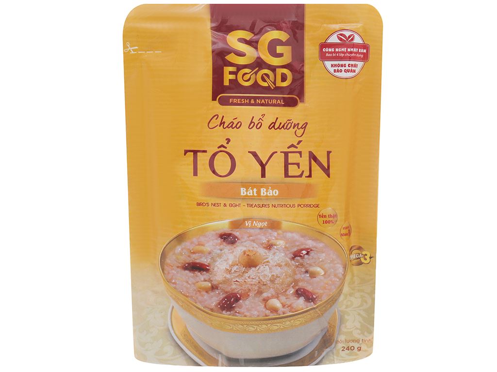 Sản phẩm cháo ăn liền tiện lợi thương hiệu cháo SG Food. Cháo bổ dưỡng SG Food tổ yến bát bảo gói 240g được làm từ các nguyên liệu tự nhiên, an toàn cho sức khỏe, hương vị cháo là sự kết hợp hài hòa của tổ yến và các loại đậu, hạt bổ dưỡng, thơm ngon cùng mùi hương hấp dẫn.