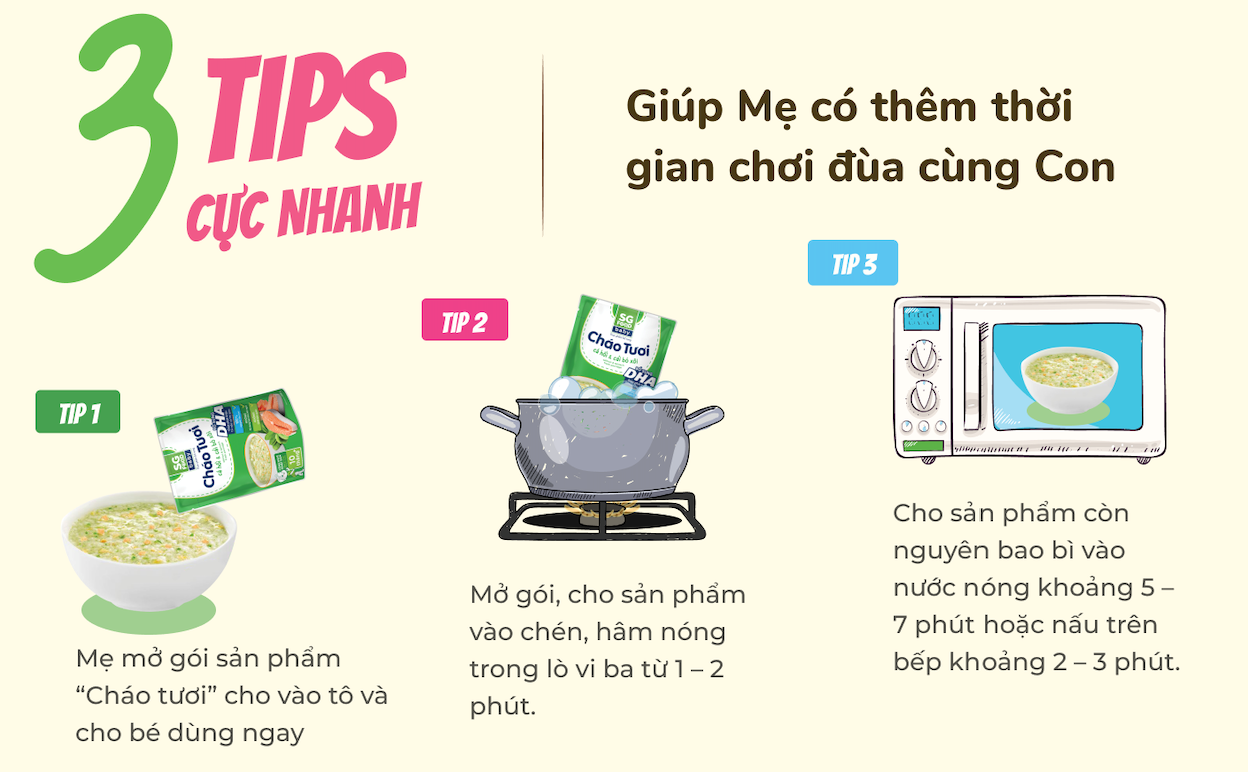 Đối với những bà mẹ bận rộn hoặc các mẹ không khả năng tự tay nấu cháo ăn dặm cho bé thì những gói cháo tươi của thương hiệu SG Food sẽ là sự thay thế vô cùng thích hợp đảm bảo dưỡng chất cũng như an toàn vệ sinh thực phẩm. Được làm bằng nguyên liệu tươi ngon nhất cùng nhiều vị khác nhau cho mẹ tha hồ lựa chọn cũng như đa dạng bữa ăn cho bé mà lại không tốn quá nhiều thời gian. Được thành lập từ 18/7/2003, Công ty CP Sài Gòn Food chuyên sản xuất và kinh doanh các mặt hàng thủy hải sản đông lạnh và thực phẩm chế biến cung cấp cho thị trường xuất khẩu và nội địa. Với sứ mệnh “Mang những giải pháp tối ưu cho người phụ nữ trong việc chăm sóc bữa ăn gia đình”, Sài Gòn Food thực sự đã trở thành người bạn đồng hành đáng tin của mẹ và bé.