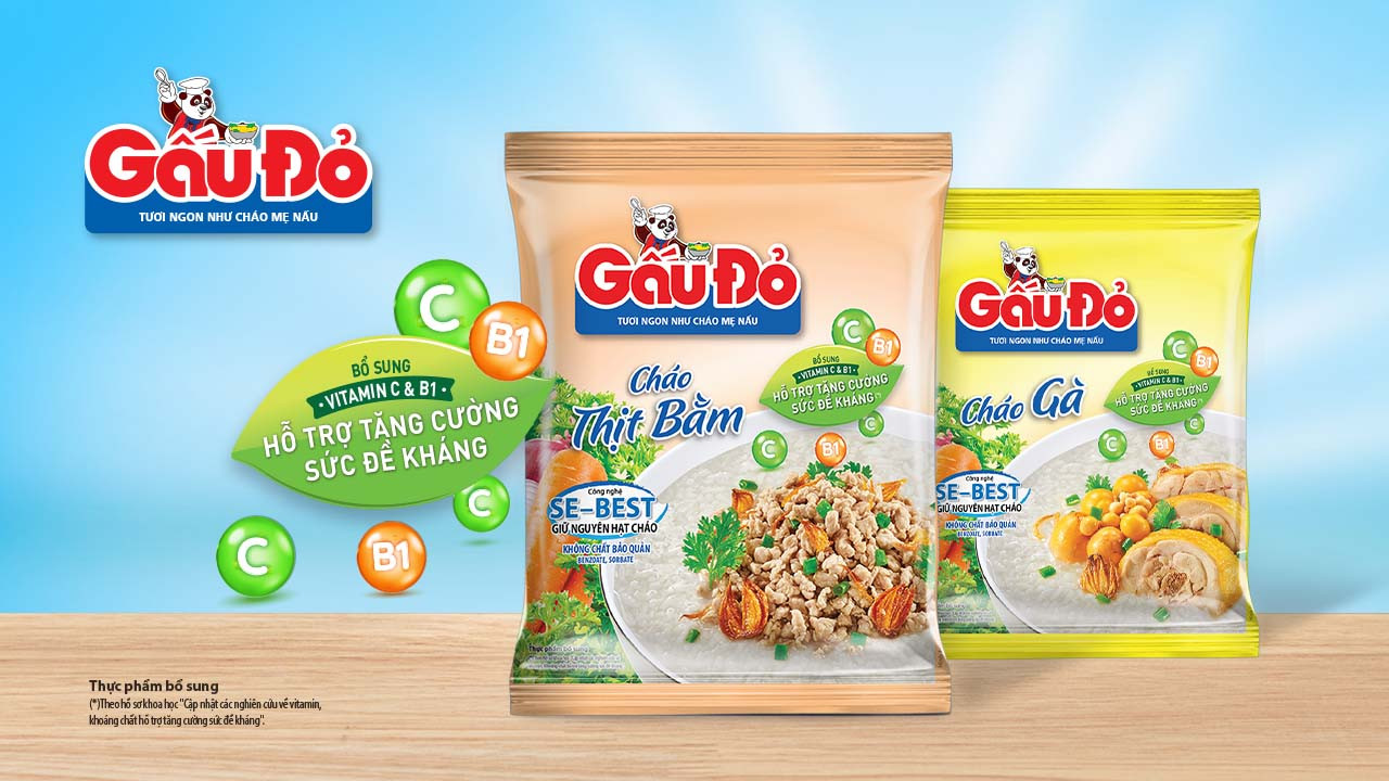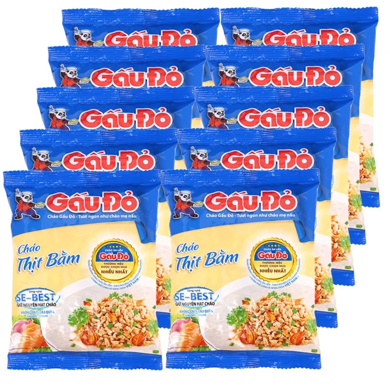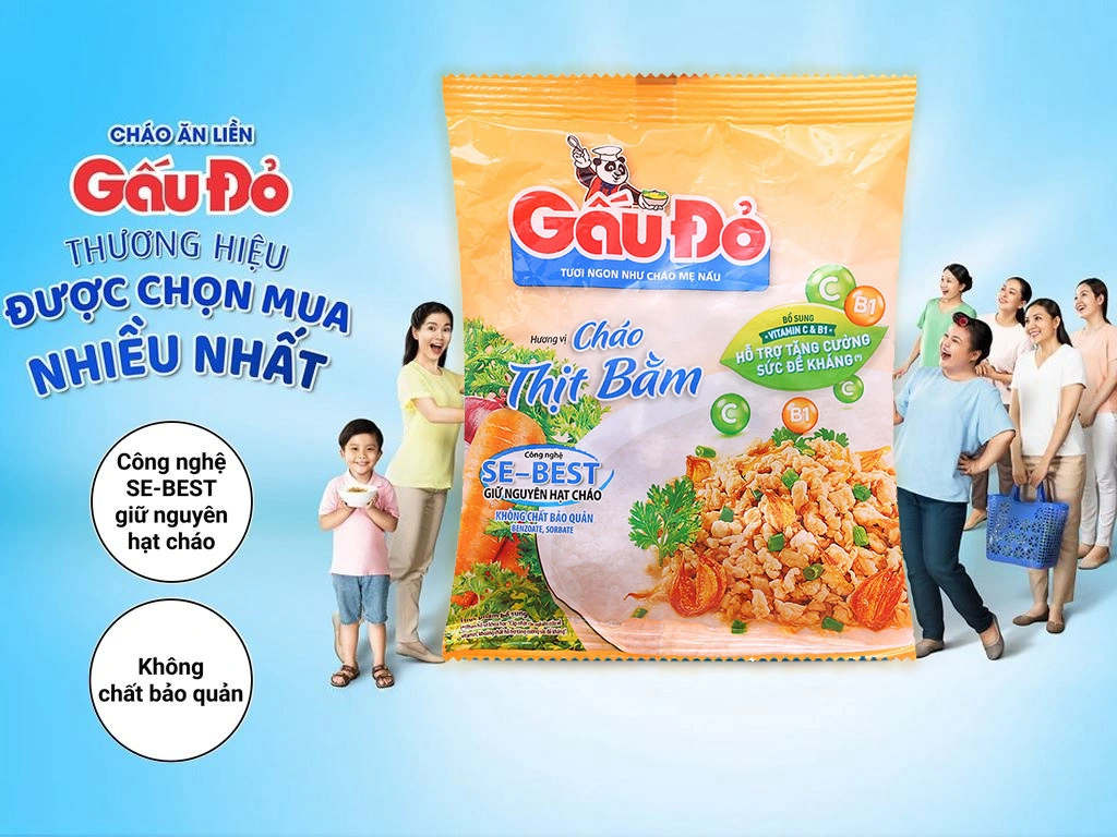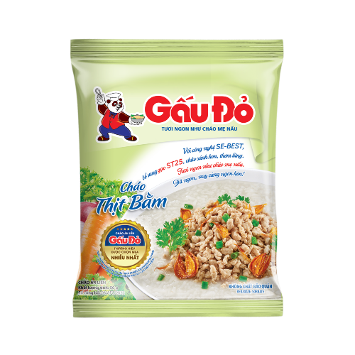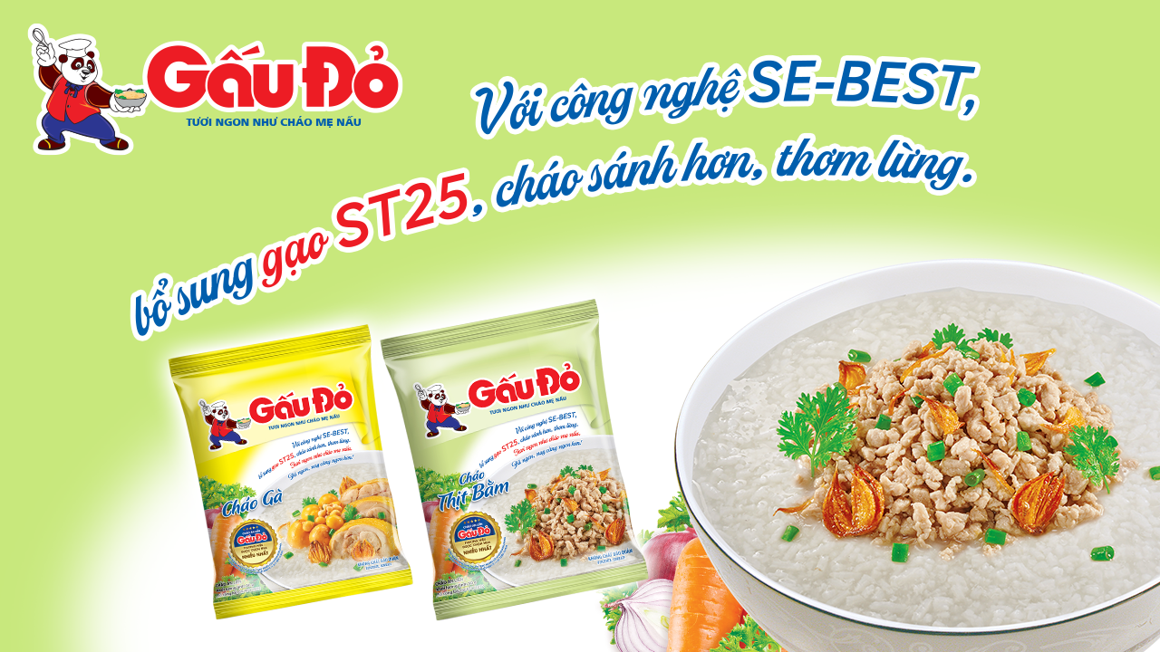 Cháo Gấu Đỏ với công nghệ Se-Best gạo thơm được làm sạch, tưới ẩm, ly tâm tách nước, giữ nguyên hạt gạo, gia nhiệt lên tới 160 độ C cho hạt cháo bung đều, sánh nhuyễn. mới bổ sung gạo ST25 cho cháo sánh hơn thơm lừng, tươi ngon như cháo mẹ nấu.