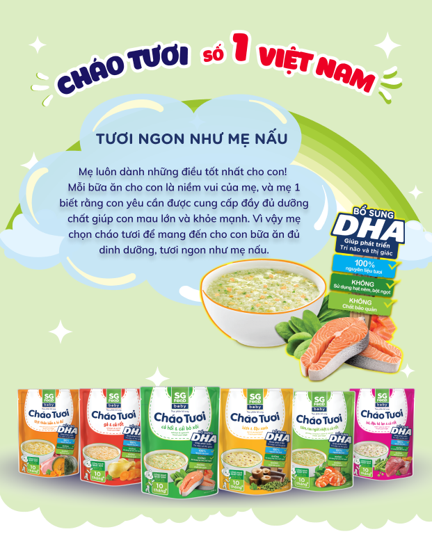 Đối với những bà mẹ bận rộn hoặc các mẹ không khả năng tự tay nấu cháo ăn dặm cho bé thì những gói cháo tươi của thương hiệu SG Food sẽ là sự thay thế vô cùng thích hợp đảm bảo dưỡng chất cũng như an toàn vệ sinh thực phẩm. Được làm bằng nguyên liệu tươi ngon nhất cùng nhiều vị khác nhau cho mẹ tha hồ lựa chọn cũng như đa dạng bữa ăn cho bé mà lại không tốn quá nhiều thời gian. Được thành lập từ 18/7/2003, Công ty CP Sài Gòn Food chuyên sản xuất và kinh doanh các mặt hàng thủy hải sản đông lạnh và thực phẩm chế biến cung cấp cho thị trường xuất khẩu và nội địa. Với sứ mệnh “Mang những giải pháp tối ưu cho người phụ nữ trong việc chăm sóc bữa ăn gia đình”, Sài Gòn Food thực sự đã trở thành người bạn đồng hành đáng tin của mẹ và bé.