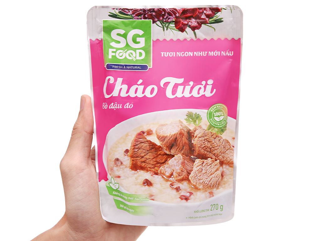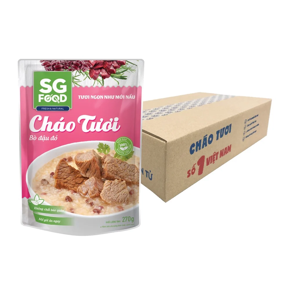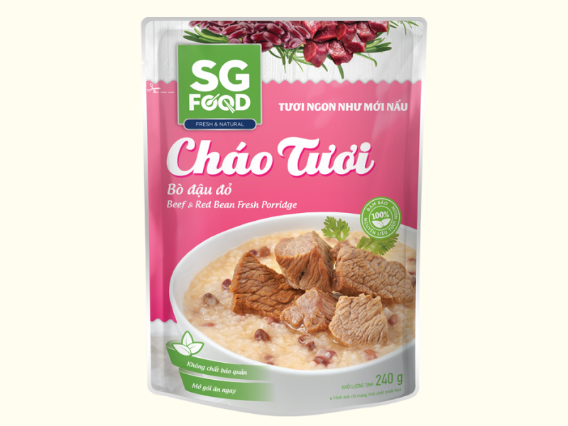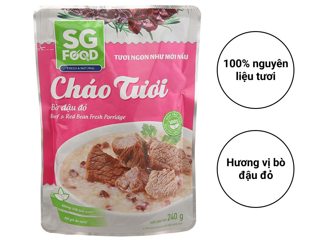 Sản phẩm cháo ăn liền tiện lợi từ thương hiệu SG Food. Cháo tươi bò đậu đỏ SG Food gói 240g được làm từ các nguyên liệu tự nhiên, an toàn cho sức khỏe, hương vị cháo là sự kết hợp hài hòa của thịt bò và đậu đỏ bổ dưỡng, thơm ngon cùng mùi hương hấp dẫn mà lại cực nhanh và đơn giản.