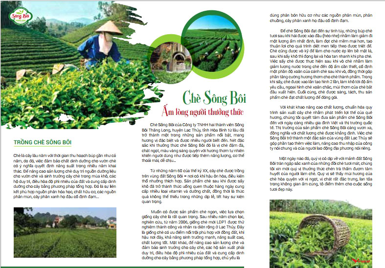Ông Phạm Văn Nho, Giám đốc công ty cho biết: Với khát khao nâng cao chất lượng, chuẩn hóa quy trình sản xuất cây chè nhằm phát triển lợi thế của quê hương, chúng tôi quyết tâm đưa sản phẩm chè Sông Bôi ngày càng đến với nhiều gia đình Việt và thị trường quốc tế. Thị trường của sản phẩm chè Sông Bôi càng vươn xa, đồng nghĩa với chất lượng chè được khẳng định. Việc chè Sông Bôi trở thành một đặc sản của vùng đất Lạc Thủy góp phần tạo thêm việc làm, nâng cao doanh thu của công ty và thu nhập của người lao động địa phương.