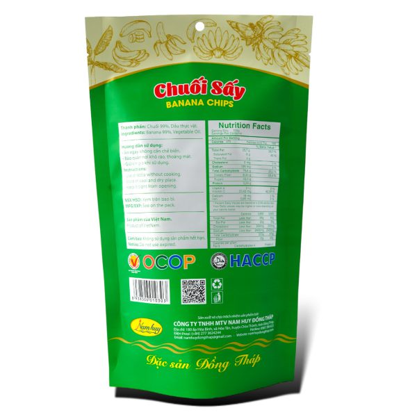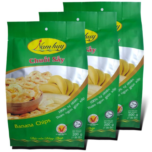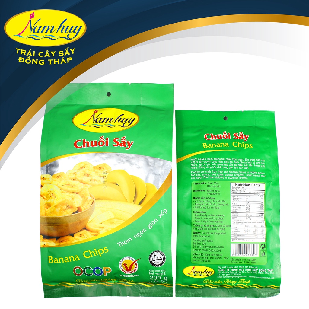 Tất cả các khâu sản xuất đều được thực hiện một cách nghiêm túc từ việc chọn nguyên liệu, gọt vỏ và cả khâu sấy. Sản phẩm được làm từ giống chuối “Xiêm” sạch kết hợp với các phụ gia chiết xuất từ thiên nhiên như: dầu thực vật đều được xử lý vệ sinh, an toàn thực phẩm.“Chuối sấy Nam Huy” là đứa con tinh thần được tạo ra từ niềm tin và trách nhiệm, cùng sự khát khao vươn tới tầm cao mới, vị thế mới, tỏa sáng trên thị trường của ông Huỳnh Văn Hiệp.