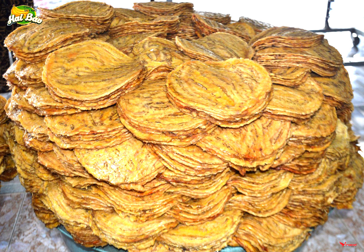• Những quả chuối đã khô sẽ được ép thật đều bằng khuôn ép hình tròn có đường kính từ 20 đến 30cm, thường thì 1 khuôn phải ép từ 3 đến 5 trái, tuỳ vào độ lớn nhỏ của chuối. Sau khi ép, từng miếng chuối được mang đi xếp đều lên vỉ được làm bằng tre hoặc sậy có kích thước từ 0,8m x 1,8 chứa được 36 khuôn chuối để phơi.