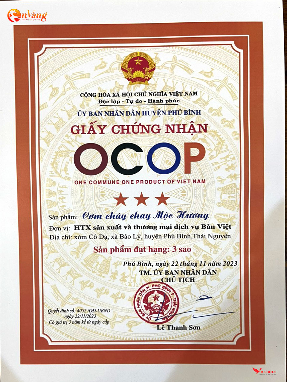 Chúng tôi sẽ giới thiệu đến mọi người một sản phẩm là sự kết tinh của những sản vật nổi tiếng trên quê hương Phú Bình, Thái Nguyên. Đó chính là cơm cháy Én Vàng của Hợp tác xã Bản Việt. Là đơn vị mới thành lập và đi vào hoạt động trong năm 2023, Hợp tác xã Bản Việt (có trụ sở tại xóm Cô Dạ, xã Bảo Lý, huyện Phú Bình) đã sản xuất sản phẩm cơm cháy từ chính nguồn nguyên liệu sẵn có tại địa phương.
