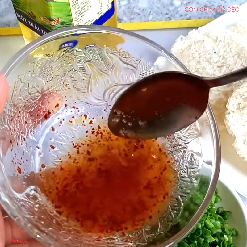 • Lấy miếng cơm cháy đã chiên ra đĩa. Rưới đều phần nước mắm mỡ hành vừa nấu lên trên sao cho có cả hành và nước mắm trên miếng cơm.
