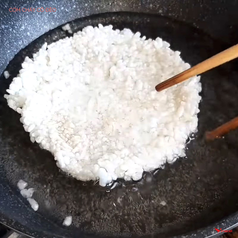 • Bắc chảo lên bếp, bật lửa vừa, dầu nóng thì cho cơm đã phơi khô hoặc sấy khô vào chảo ngập dầu rồi chiên vàng.
