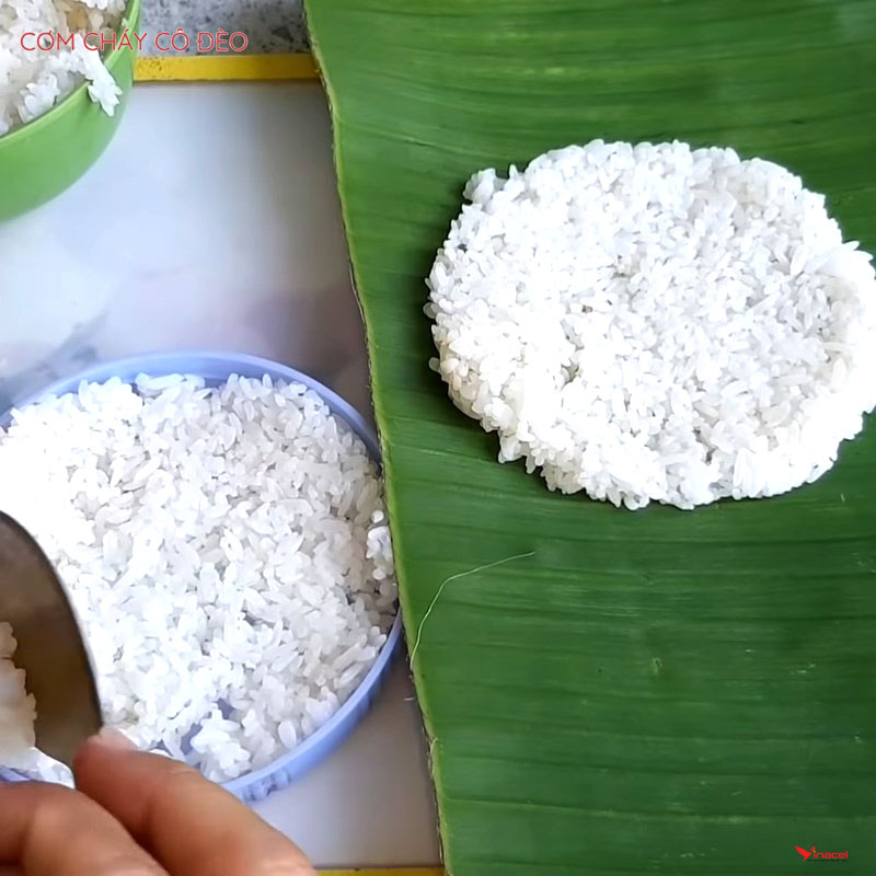 • Cho cơm nguội vào nắp hộp nhựa hoặc khuôn tròn bất kỳ để tạo hình tròn dẹt cho cơm cháy, dàn mỏng đều, ấn chặt tay cho cơm dính lại với nhau, nếu không khi chiên sẽ bị bể, không ngon.