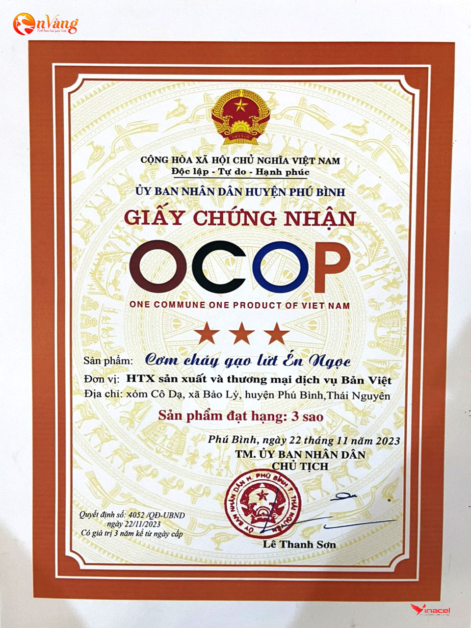 Chúng tôi sẽ giới thiệu đến mọi người một sản phẩm là sự kết tinh của những sản vật nổi tiếng trên quê hương Phú Bình, Thái Nguyên. Đó chính là cơm cháy Én Vàng của Hợp tác xã Bản Việt. Là đơn vị mới thành lập và đi vào hoạt động trong năm 2023, Hợp tác xã Bản Việt (có trụ sở tại xóm Cô Dạ, xã Bảo Lý, huyện Phú Bình) đã sản xuất sản phẩm cơm cháy từ chính nguồn nguyên liệu sẵn có tại địa phương.