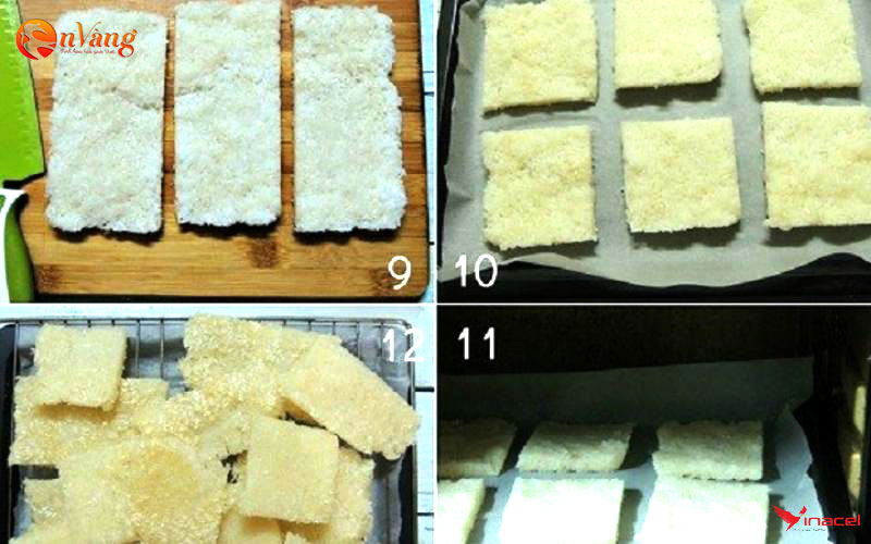 Sau khi cơm đã se khô và hơi cứng lại, bạn cắt cơm thành từng miếng nhỏ.
