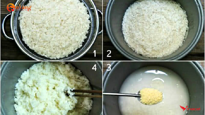 Trộn đều gạo và gạo nếp với nhau. Cho vào nồi cơm điện, vo sạch, đổ nước xâm xấp mặt rồi nấu chín. Có thể cho thêm một muỗng canh bột nêm và một muỗng dầu ăn để làm tăng hương vị món ăn.