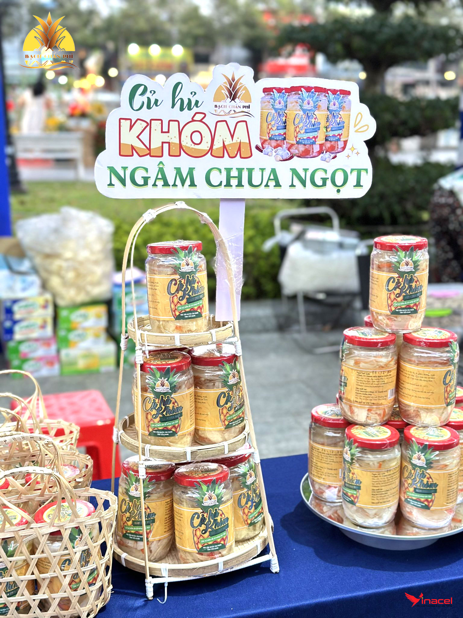 Sản phẩm chính là Củ hủ khóm ngâm chua ngọt. Củ hủ khóm là phần non của cây khóm chưa ra trái, vị nhẫn nhẹ, hậu thanh ngọt, hương vị đặc trưng. Trong củ hủ khóm chứa nhiều chất khoáng, chất xơ và đặc biệt là bromelain giúp hỗ trợ tiêu hóa, làm mềm thực phẩm khó tiêu, hỗ trợ làm lành vết thương.