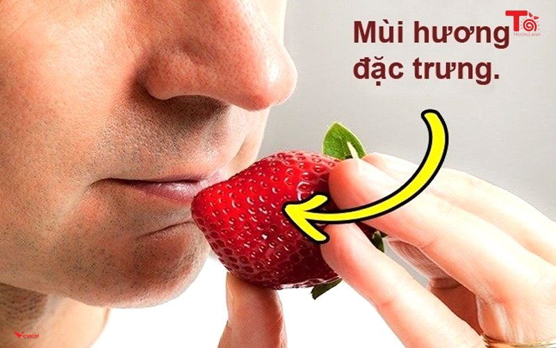 Mùi hương là dấu hiệu dễ dàng nhận biết chất lượng dâu tây nhất, khi ngửi thử thấy có mùi thơm dịu đặc trưng. Trong khi những quả dâu tây chín ép hoặc bị phun thuốc, thường không có mùi thơm hoặc chỉ có mùi thoang thoảng.