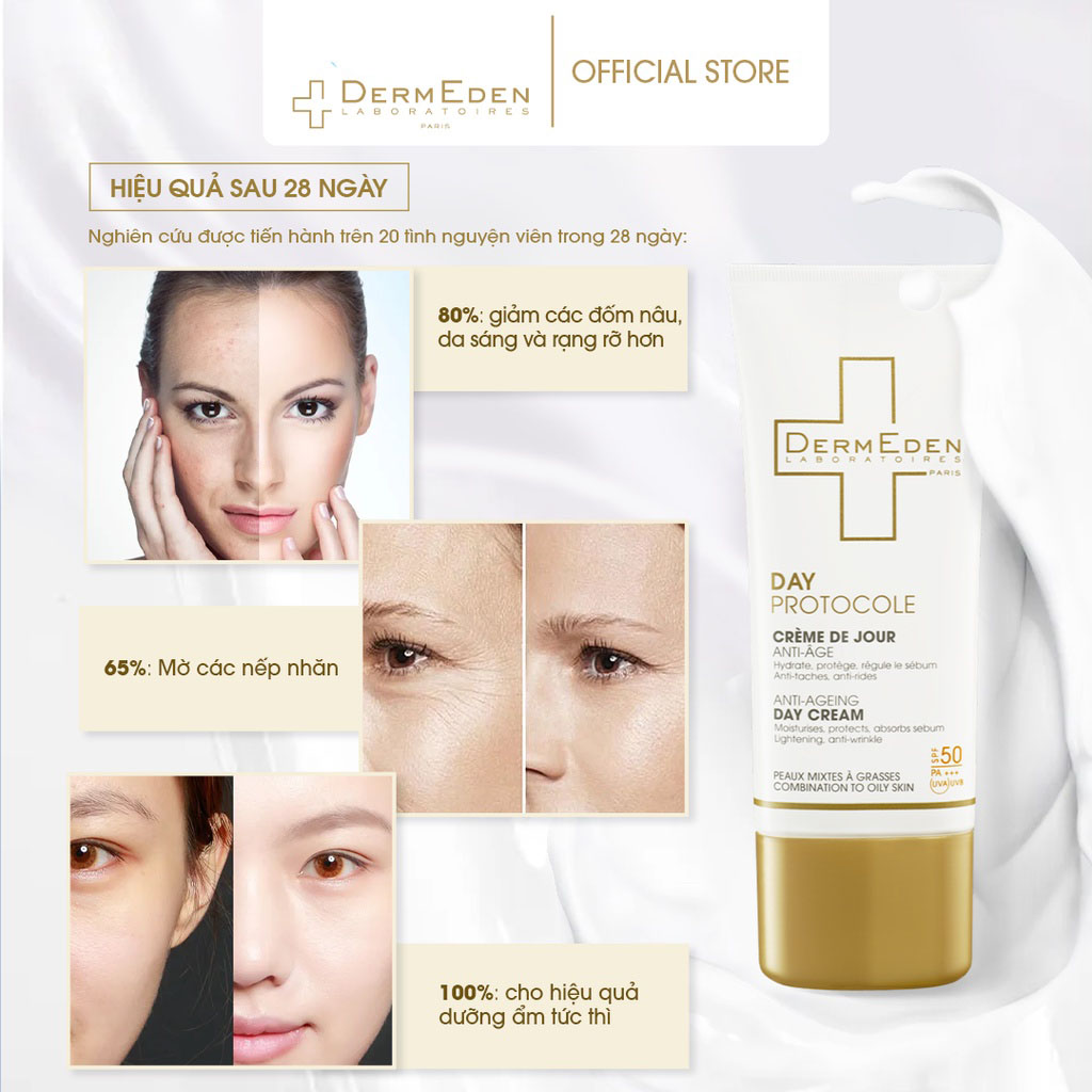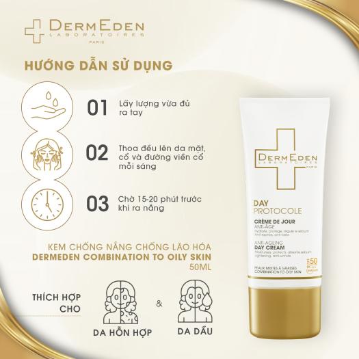 Kem chống lão hóa và chống nắng SPF 50, dùng ban ngày dành cho da hỗn hợp và da dầu giúp bảo vệ da khỏi những tác hại bên ngoài (tia UV, ô nhiễm, ánh sáng xanh, các gốc tự do…). Cân bằng sự tiết dầu trên da giúp da tránh được tình trạng bít tắt lỗ chân lông là nguyên nhân gây ra mụn. Làm đầy nếp nhăn và điều trị đốm nâu giúp da mịn màng, tươi sáng. Ngăn ngừa lão hoá da sớm với chỉ số chống nắng SPF 50. Tăng cường dưỡng ẩm cho da. Là 1 loại kem lót trang điểm hoàn hảo giúp che phủ những vùng da không đều màu và đường nhăn mang lại vẻ đẹp tự nhiên cho làn da và rạng rỡ suốt cả ngày.