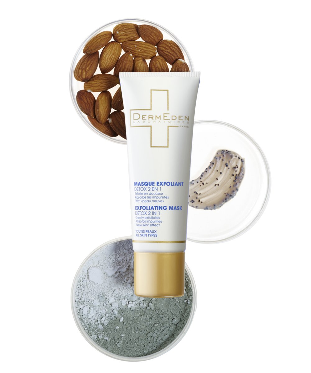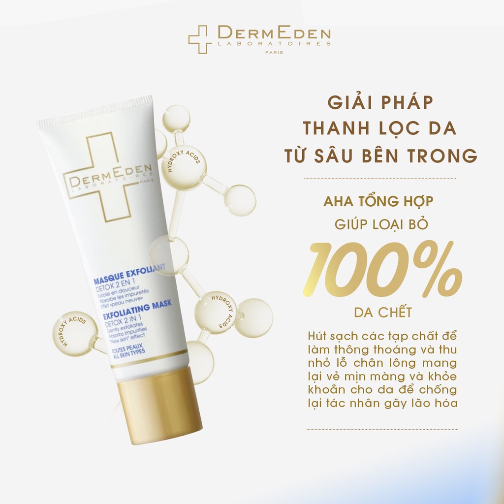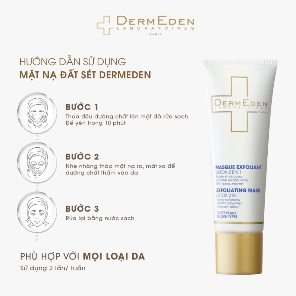 2. Tẩy tế bào chết để loại bỏ tạp chất. Với DermEden 2 in 1 Detox Mask, 2 bước được thực hiện trong một.