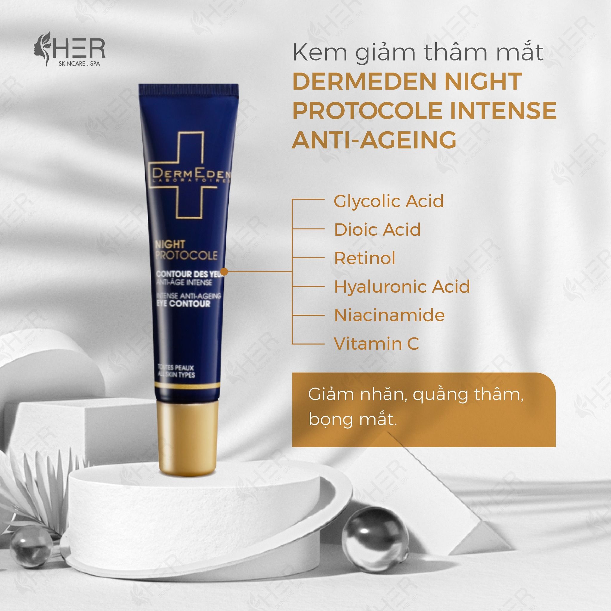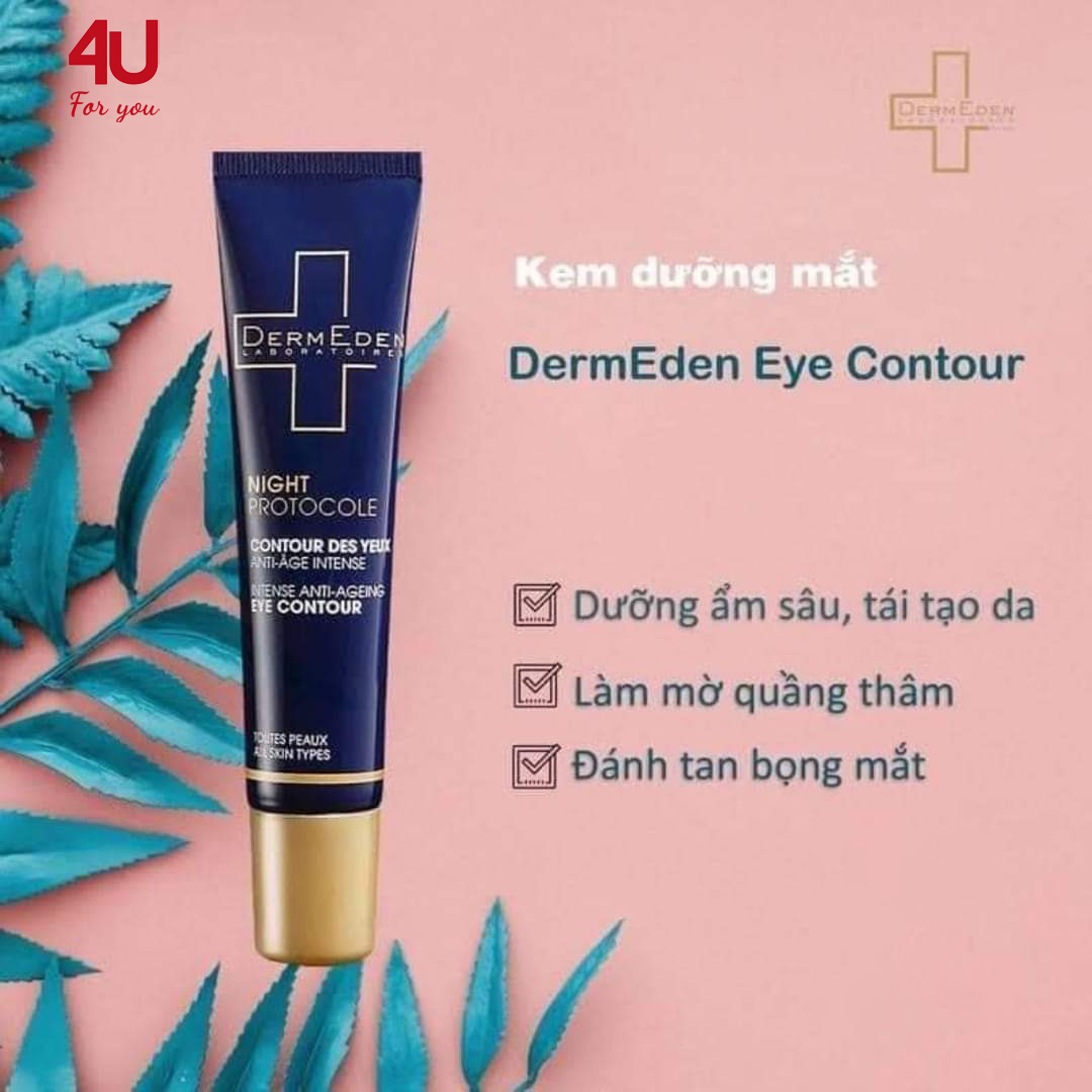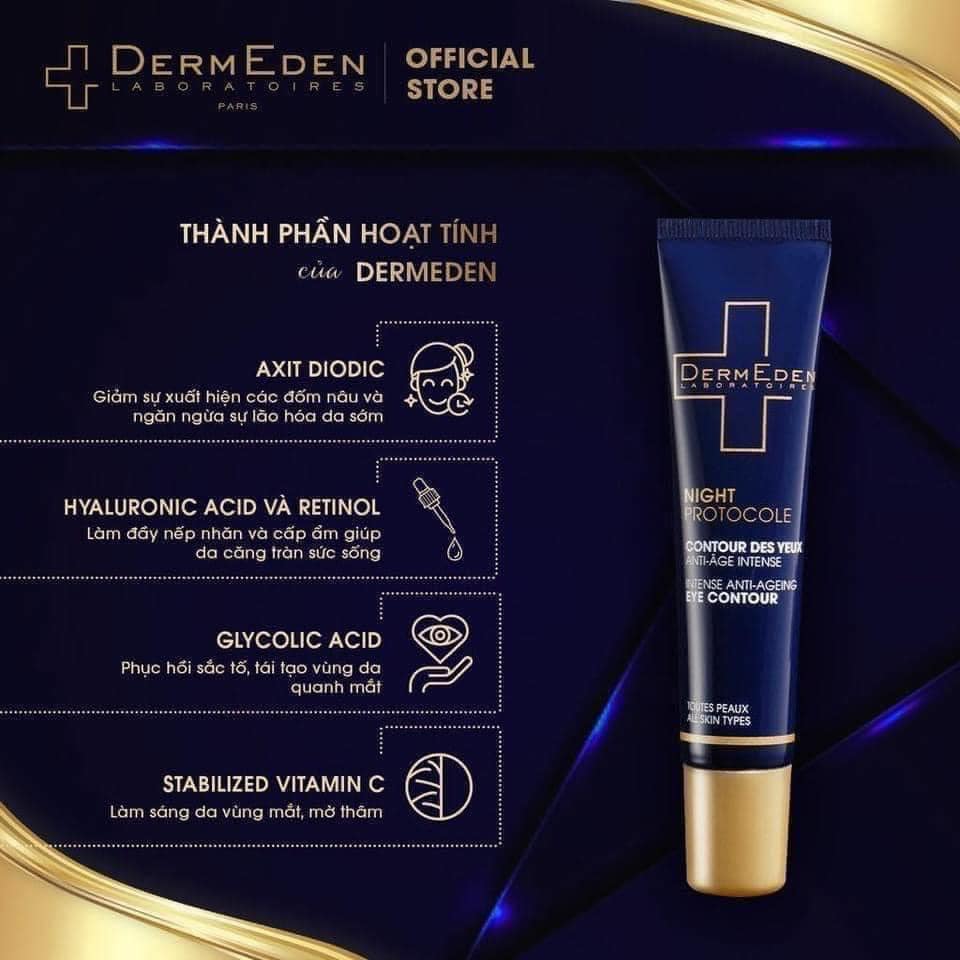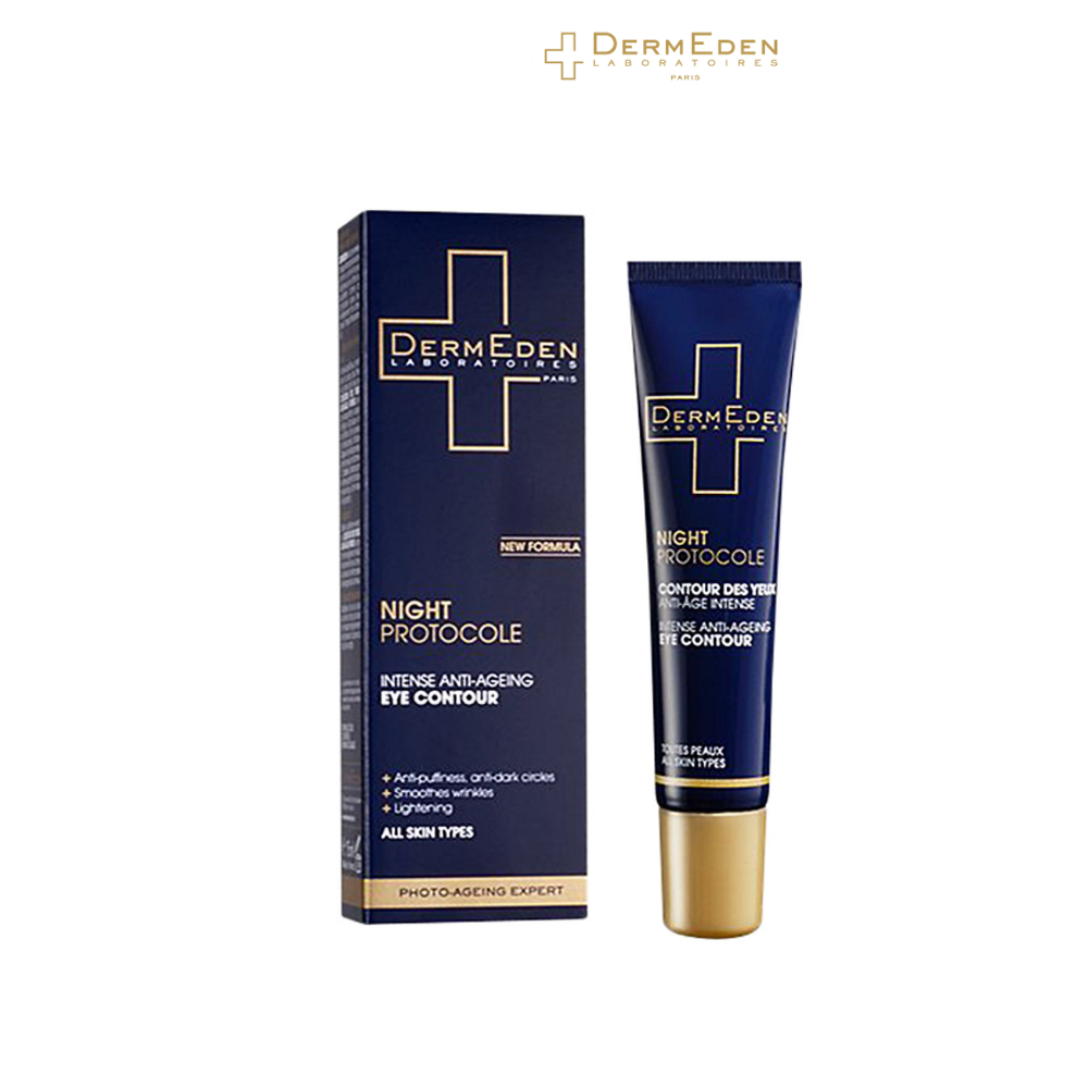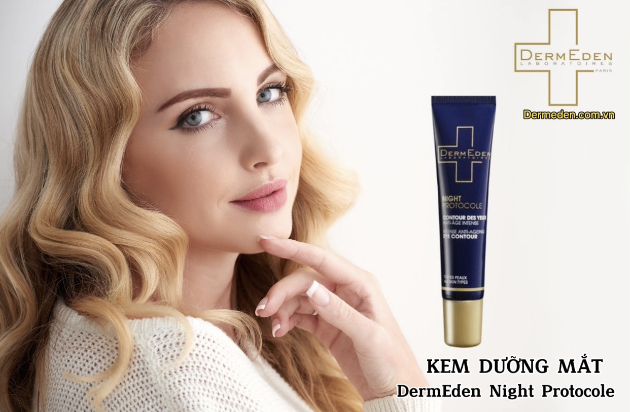 Kem dưỡng mắt DermEden Night Protocole Intense Anti-Ageing Eye Contour được biết đến là dòng sản phẩm nổi tiếng nhất của thương hiệu DermEden. Với các tác động tái sinh lại da vùng quanh mắt hiệu quả tức thì. Da vùng quanh mắt luôn là da nhạy cảm, mỏng mạnh hơn các làn da khu vực khác trên mặt. Vì vậy các dấu hiệu nhăn, lão hóa luôn xuất hiện đầu tiên ở vùng qua quanh mắt.