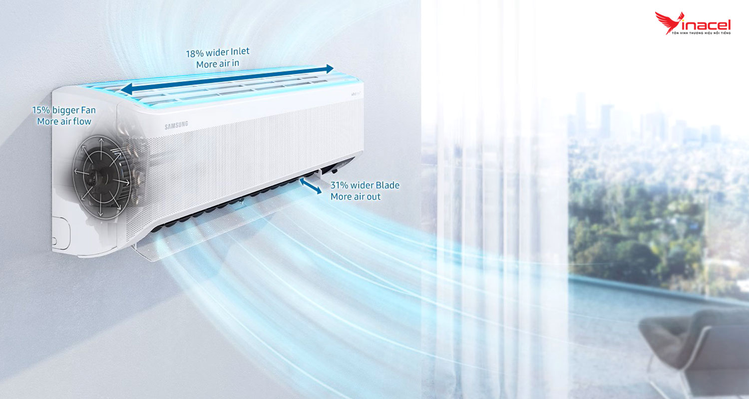 - Dòng điều hòa Samsung tung ra thị trường được cấu tạo từ 3 mặt trụ tam giác: mặt ốp tường, mặt trên và mặt dưới giúp mở rộng bề mặt hút nhiều hơn 39%, thổi khí mạnh hơn 54% và chu vi của quạt gió tăng 22%. Nhờ đó, khả năng làm mát và tản không khí ra khắp phòng có tốc độ nhanh.