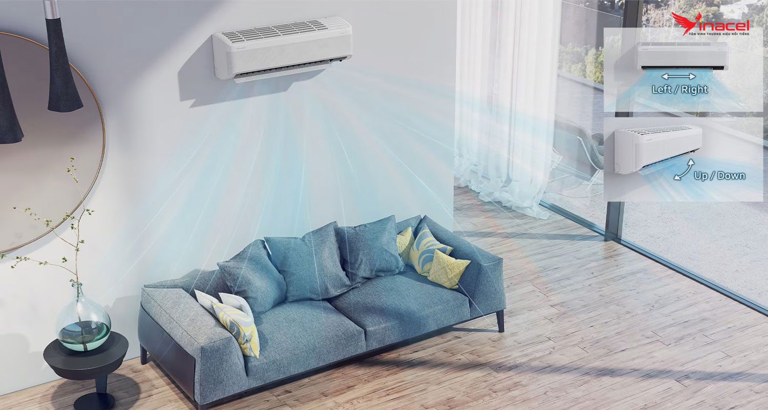 - Cánh đảo gió 4 chiều điều khiển hướng gió lên/xuống, trái/phải bằng điều khiển từ xa, mang đến nhiệt độ đồng đều khắp phòng.