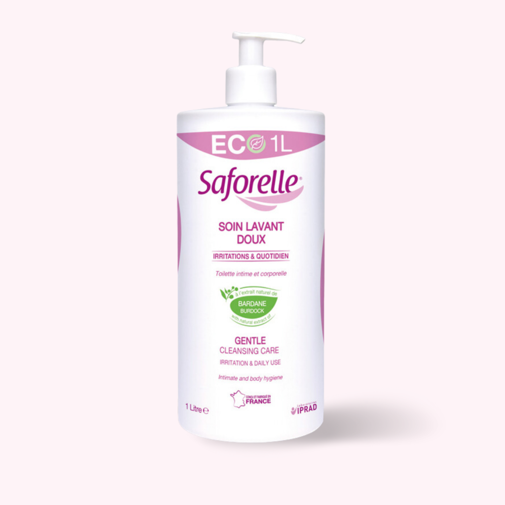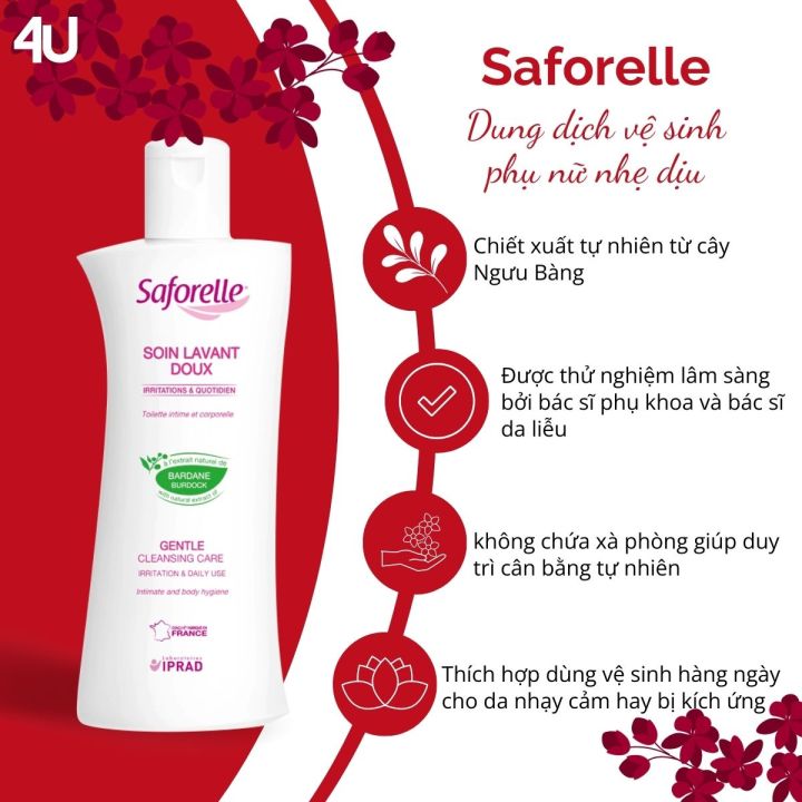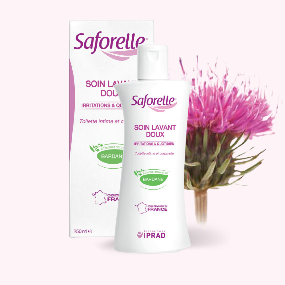 - Saforelle Gentle Cleansing Care được chế tạo đặc biệt cho làn da nhạy cảm hoặc bị kích ứng nhờ thành phần chiết xuất Ngưu Bàng. Tác động làm sạch nhẹ nhàng nhờ công thức không xà phòng.