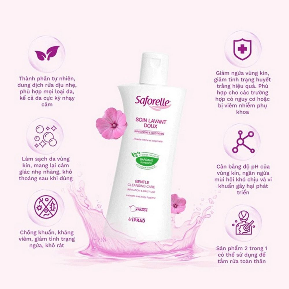 Saforelle là thương hiệu dung dịch vệ sinh phụ nữ được chị em đánh giá là có nhiều tác dụng tích cực đến việc chăm sóc và bảo vệ "Cô bé". Saforelle Gentle Cleansing Care là dung dịch vệ sinh phụ nữ được chế tạo đặc biệt cho làn da nhạy cảm hoặc dễ bị kích ứng. Sản phẩm có tác động làm sạch nhẹ nhàng, xoa dịu sự ngứa ngáy và khó chịu.