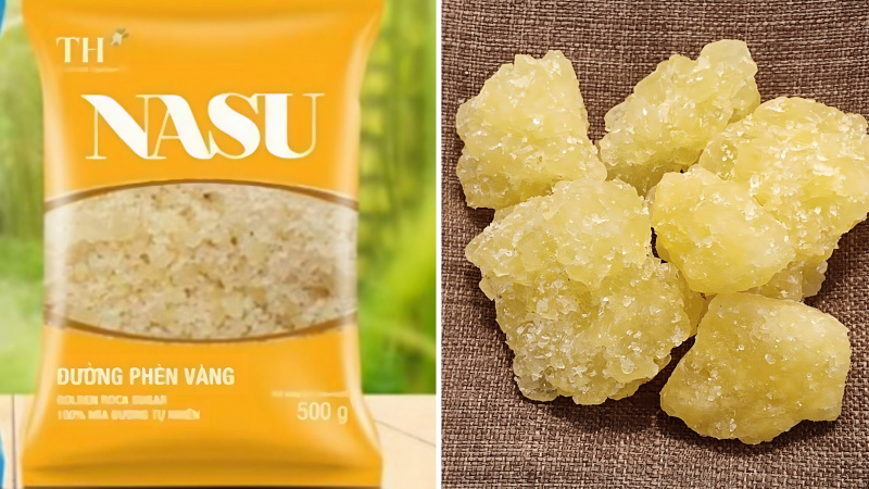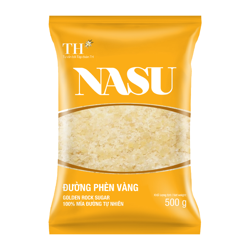 Đường phèn vàng TH Nasu cũng được sản xuất từ nguyên liệu mía tự nhiên. So với đường phèn trắng, đường phèn vàng có quy trình chế biến đơn giản hơn. Quy trình chế biến đường phèn vàng không đòi hỏi các bước xử lý hoá học phức tạp như đường phèn trắng. Điều này làm cho đường phèn vàng giữ lại được các thành phần tự nhiên và màu vàng nhạt đặc trưng, trong khi đường phèn trắng được tinh chế hoàn toàn để loại bỏ màu và các thành phần phụ khác.