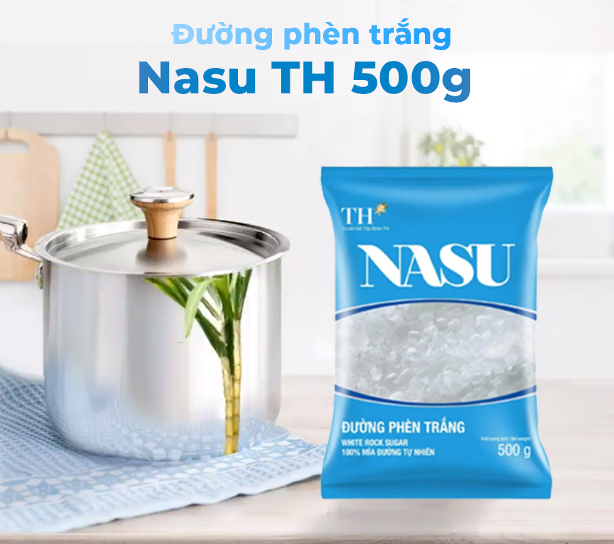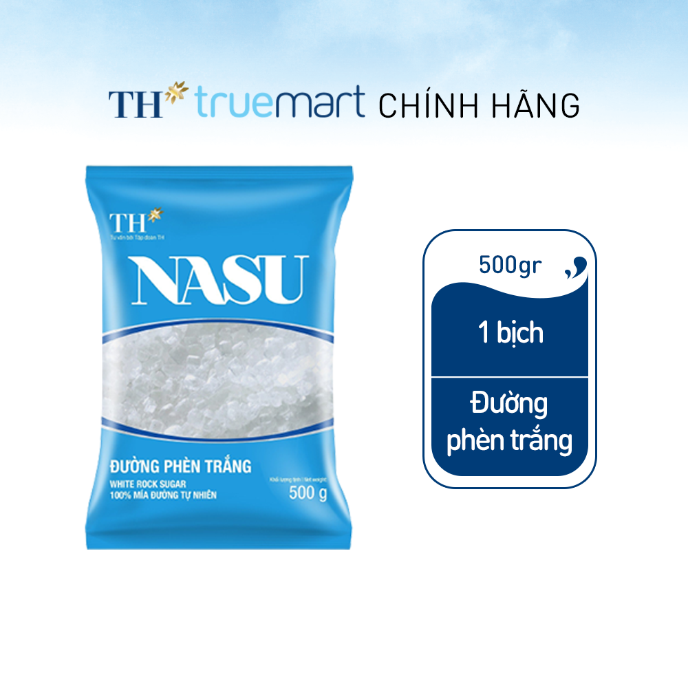 Sản phẩm đường phèn trắng TH Nasu được đóng gói thành các túi nhỏ 0.5kg, đựng trong bao bì màu xanh dương và có thể nhìn thấy kết cấu bên trong. Với chất lượng và sự uy tín, đường phèn trắng TH Nasu đã trở thành lựa chọn hàng đầu của người tiêu dùng. Sản phẩm này hiện đang được phân phối tại các siêu thị TH True Mart và các chuỗi cửa hàng bán lẻ trên toàn quốc với mức giá khoảng 34.000 đồng/kg.
