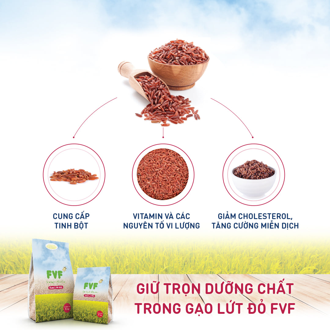 Bữa ăn thêm ngon, lối sống thêm khỏe từ gạo ngon, dinh dưỡng. Gạo Lứt Đỏ FVF hoàn tự nhiên, có chất lượng vượt trội, nguồn gốc rõ ràng, giàu dinh dưỡng với nhiều vitamin nhóm B và khoáng chất; cho cơm dẻo, đậm vị, thơm ngon. Gạo lứt đỏ là loại gạo tẻ thông thường có vỏ màu đỏ nâu nhưng ruột trắng, khi nấu chín sẽ khá dẻo. Đặc điểm của loại gạo này là: Sau khi xay xát phần trấu sẽ được bảo quản ngay trong môi trường chân không thông qua máy hút chân không và túi đựng thực phẩm.