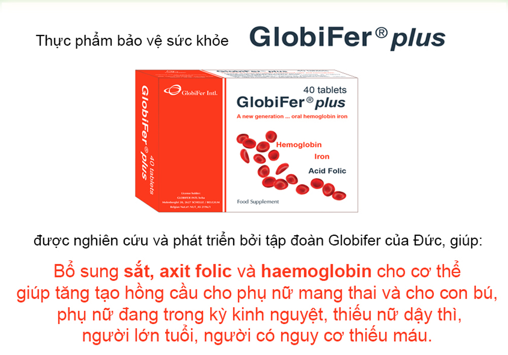 Globifer plus là sản phẩm được nghiên cứu và phát triển bởi các nhà khoa học Đức. Thực phẩm bảo vệ sức khoẻ Globifer® Plus bổ sung sắt, axit folic và haemoglobin cho cơ thể giúp tăng tạo hồng cầu cho phụ nữ mang thai và cho con bú, phụ nữ đang trong kì kinh nguyệt, thiếu nữ dậy thì, người bị thiếu máu.