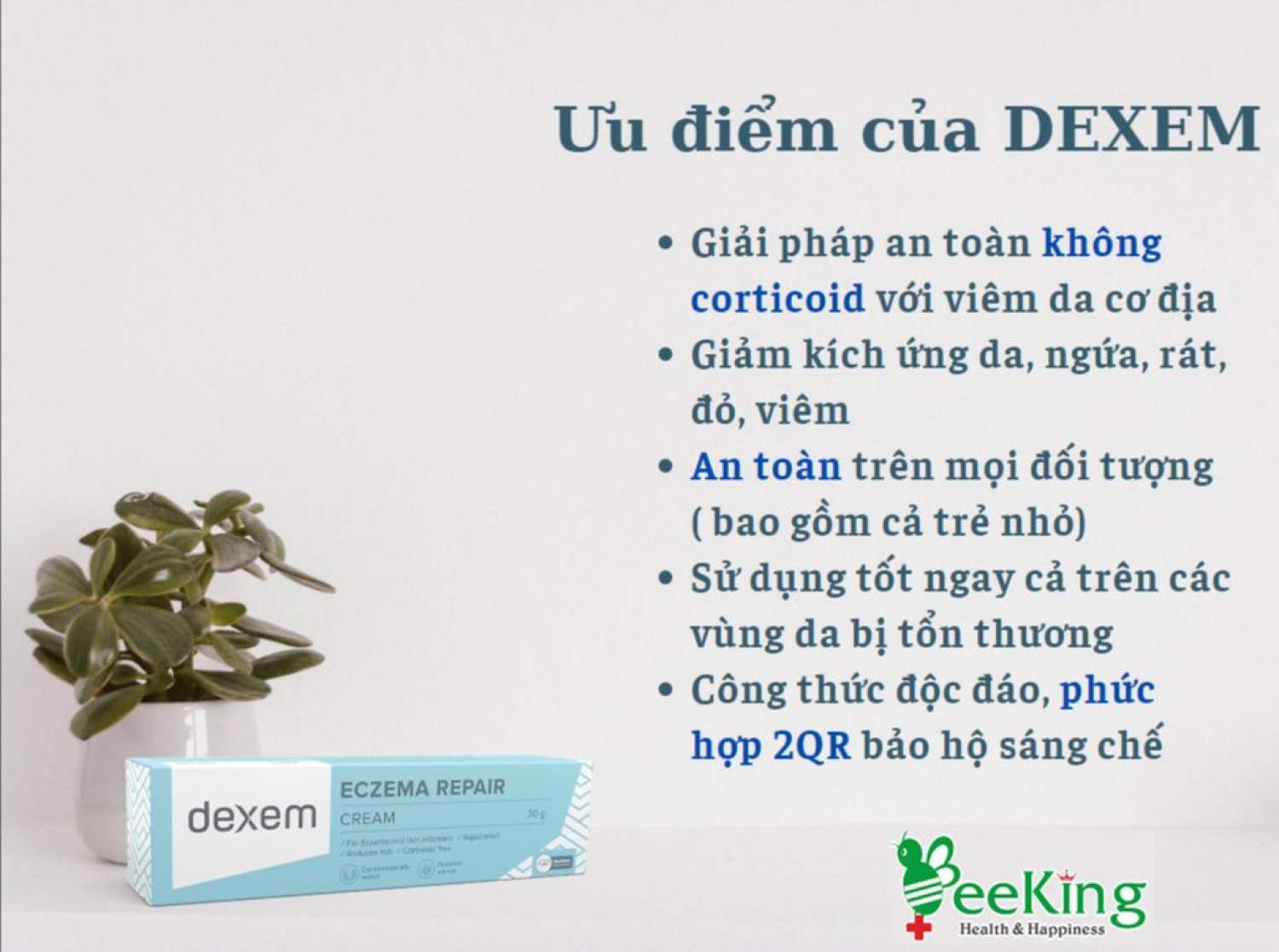 Kem bôi chàm viêm da cơ địa Dexem Cream được biết đến là dòng kem bôi có tác dụng trong việc hỗ trợ làm giảm triệu chứng bệnh chàm, vẩy nến, viêm da cơ địa, dị ứng da đang được nhiều khách hàng yêu chuộng và tin dùng hàng đầu hiện nay. Ưu điểm nổi bật của kem bôi chàm Dexem Cream 1. Công dụng nổi bật Dòng kem bôi chàm Dexem Cream ghi đậm dấu ấn với khách hàng bởi đây là dòng thiết bị y tế sở hữu khả năng hỗ trợ điều trị chàm.